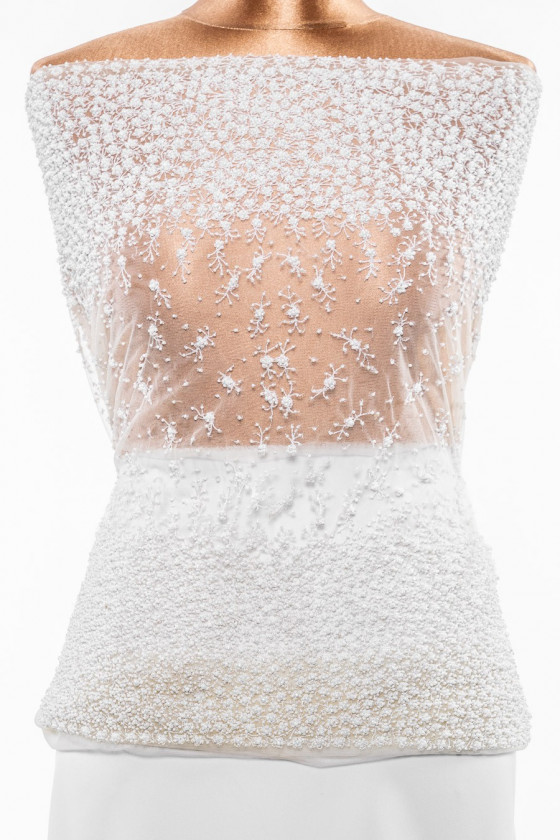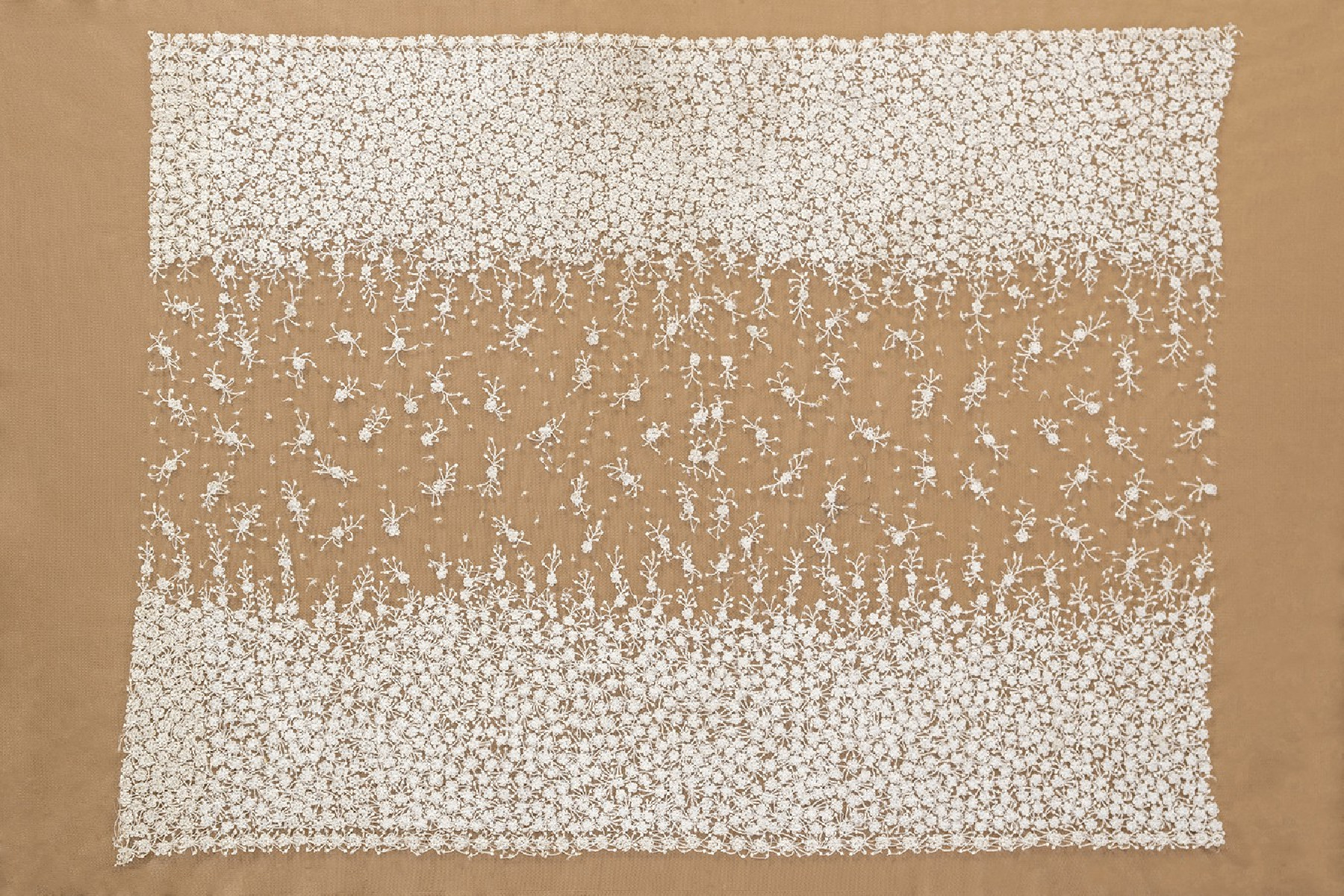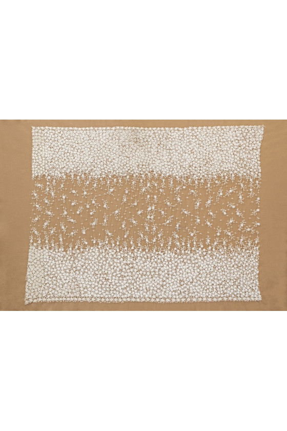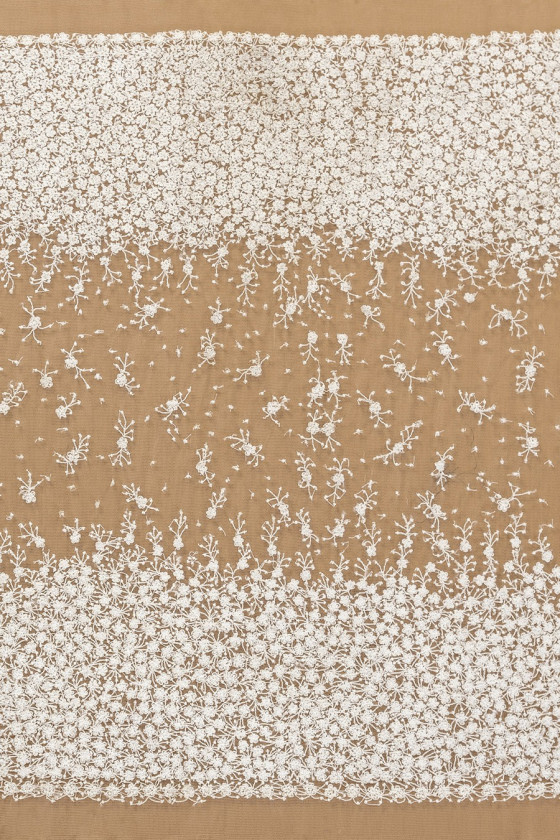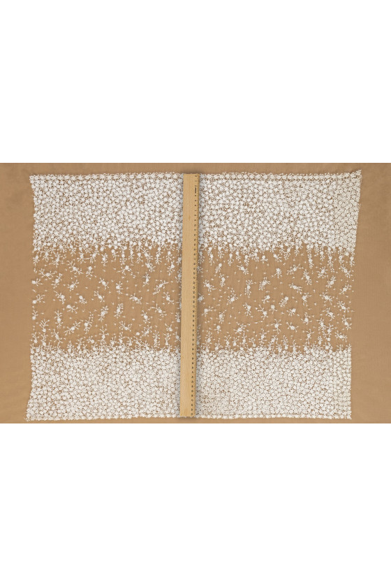 Appliqué de mariage italien sous la forme d’un corset (uniquement le devant) de couleur crème. Motif de petites fleurs faites de perles lumineuses. Le motif est clairsemé au milieu et s’épaissit vers les bords. Dimensions : largeur 65 cm, hauteur 50 cm.