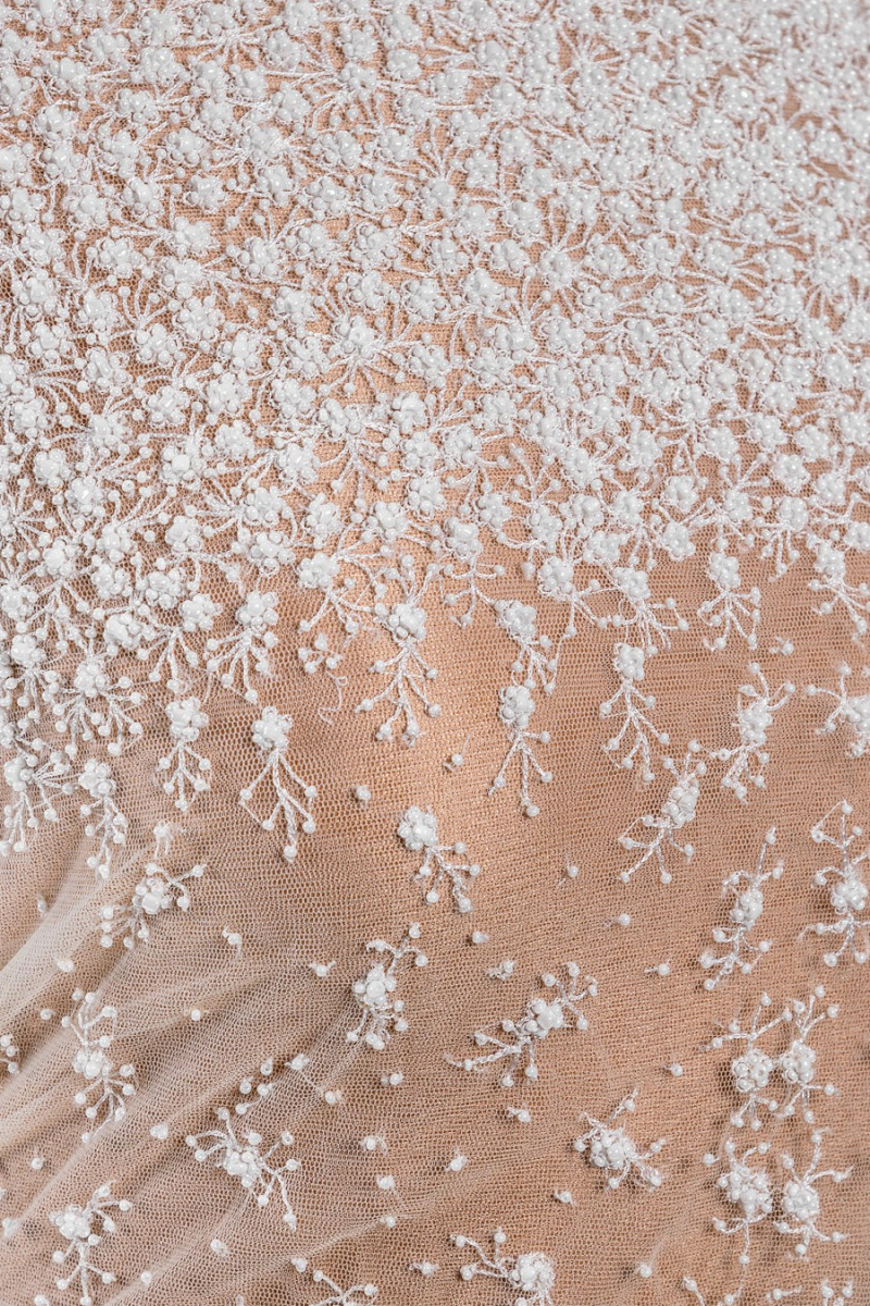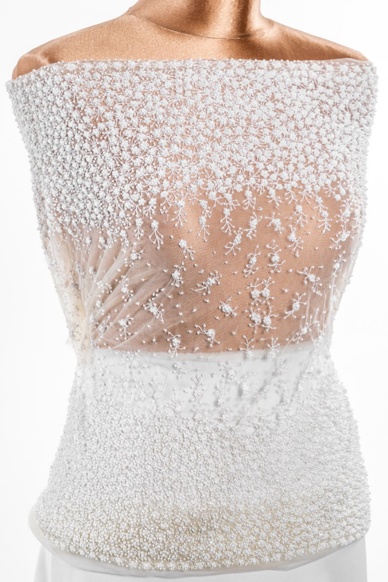 Appliqué de mariage italien sous la forme d’un corset (uniquement le devant) de couleur crème. Motif de petites fleurs faites de perles lumineuses. Le motif est clairsemé au milieu et s’épaissit vers les bords.