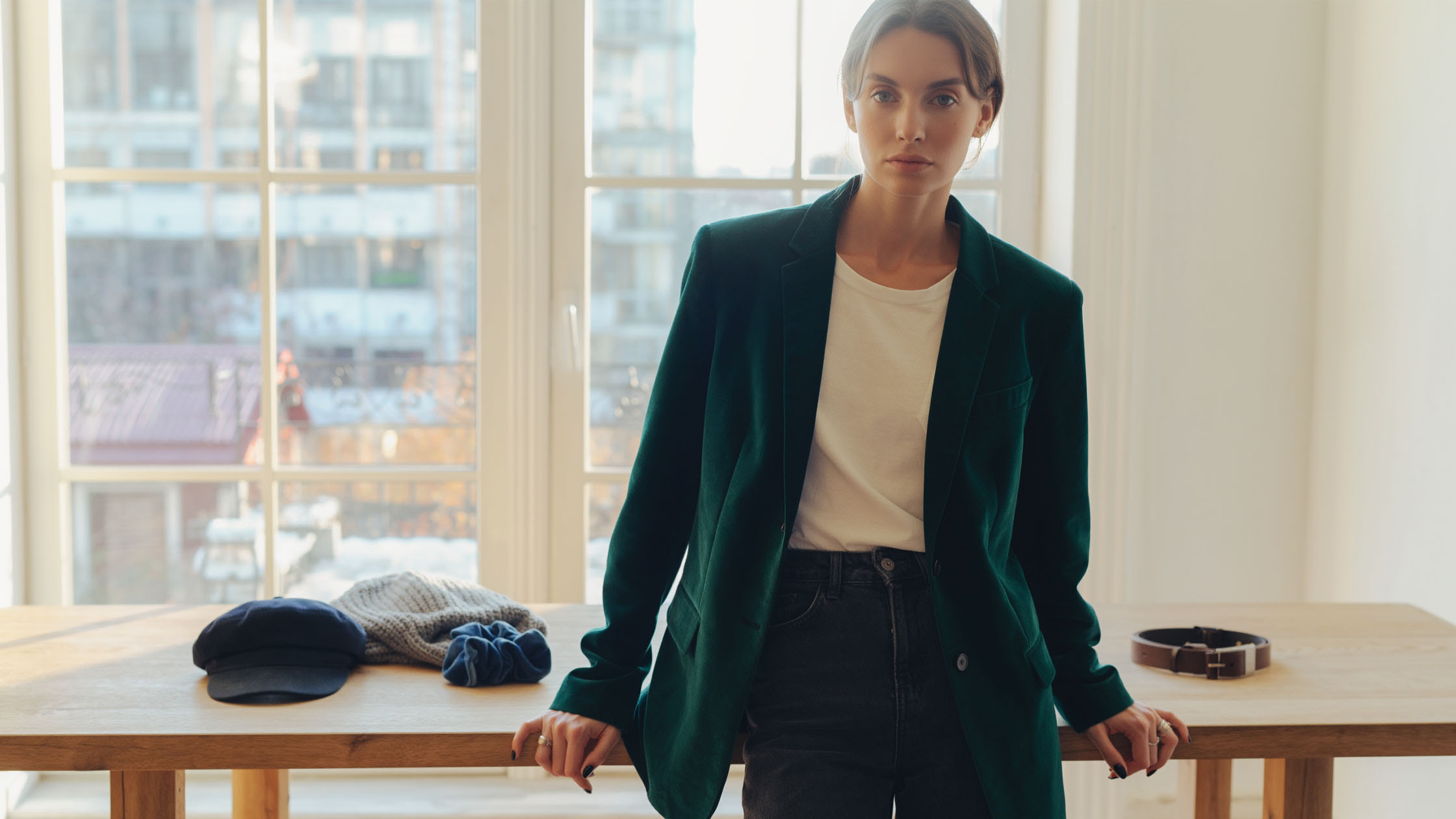 La mode moderne s’éloigne des tailles lourdes, limitant les mouvements des vestes au profit de formes plus amples qui offrent liberté et air entre le corps et le tissu. Lors de la couture d’une veste en velours de coton, il vaut la peine de considérer des coupes surdimensionnées avec une épaule abaissée ou des coupes simples et carrées faisant référence à l’esthétique des années 80 et 90. Un tel design fait que le matériau fonctionne magnifiquement en mouvement, et la lumière se réfracte dessus de manière peu évidente, exposant ses qualités. Une coupe plus ample permet aussi de superposer librement les vêtements, ce qui est inestimable lors des jours froids où l’on souhaite porter un col roulé fin ou un pull en laine mérinos sous la veste. La veste en velours carré s’accorde bien avec un bas étroit, créant une silhouette moderne basée sur le jeu des proportions. En choisissant une telle coupe, nous donnons au tissu un contexte moderne, rompant avec son image historique quelque peu rigide.