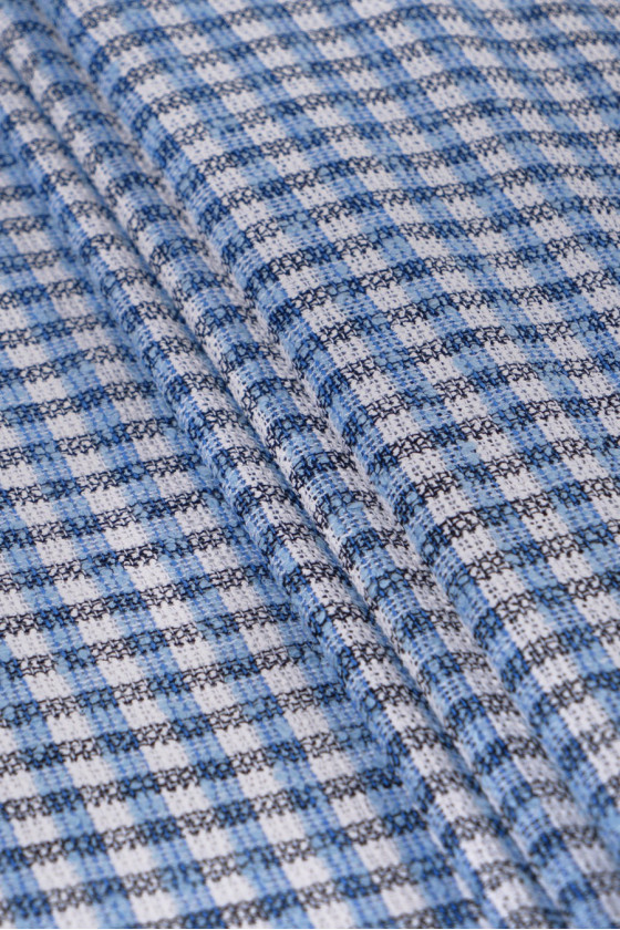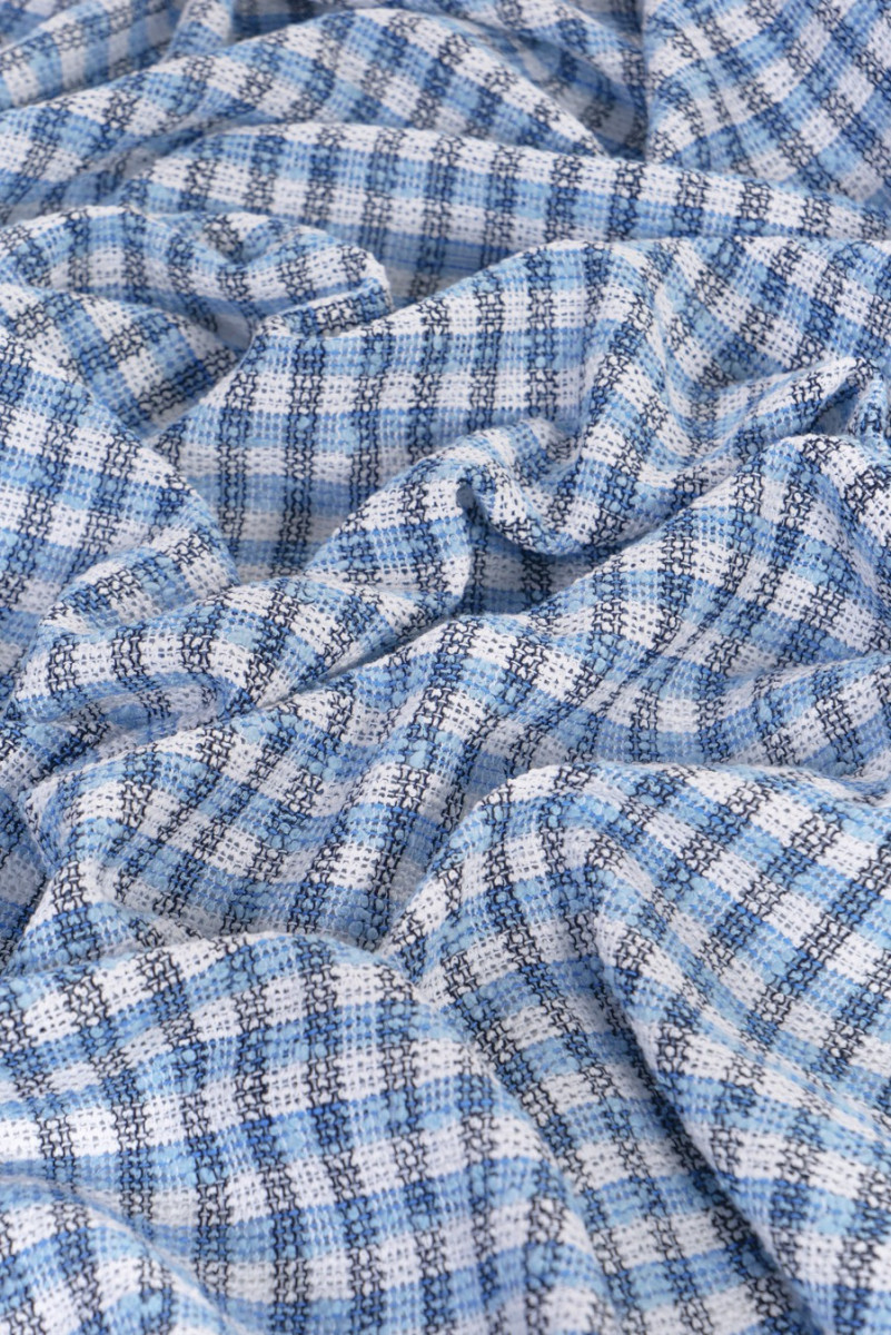 Tissu chanel d’été tissé de manière lâche. Le motif est tissé dans un carreau blanc et bleu d’une taille de 2,5x2,5 cm avec des entrelacs bleu foncé. Le tissu est composé à 100% de viscose, respirant et respirant. Nous le recommandons pour coudre des robes, des trenchs, des jupes. En raison du tissage lâche, nous vous recommandons de choisir la bonne doublure.