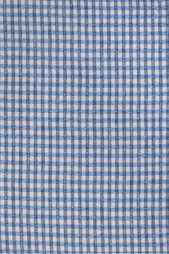 Tissu chanel d’été tissé de manière lâche. Le motif est tissé dans un carreau blanc et bleu d’une taille de 2,5x2,5 cm avec des entrelacs bleu foncé.