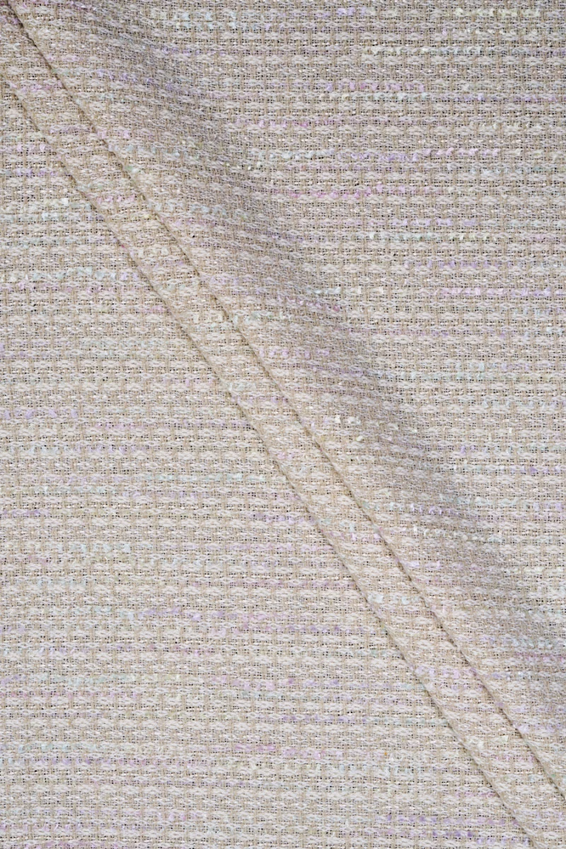 Tissu de costume chanel italien en beige clair et froid avec rose, crème et menthe, entrelacs horizontaux. Le tissu à la structure légèrement convexe et au tissage plus lâche a été délicatement décoré d’un fil brillant, ce qui lui ajoute de l’élégance. Le tissu est composé principalement de fibres naturelles, il est donc très confortable à porter, et l’ajout de fil synthétique le rend plus durable et ne se froisse pas. Une proposition fantastique pour les fans de vêtements en tweed aux couleurs vives du printemps.