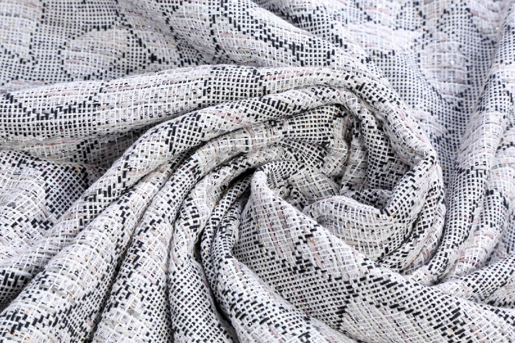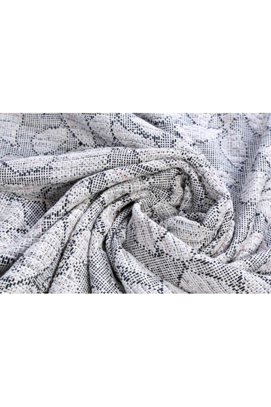 Tissu de costume de feuille de Chanel avec de petites paillettes. Conçu pour les robes, les jupes ou les vestes. Le tissu est tissé à partir de fibres naturelles - laine et viscose, ce qui assure un confort de port. Nous vous recommandons de choisir une doublure que vous pouvez trouver dans notre magasin.