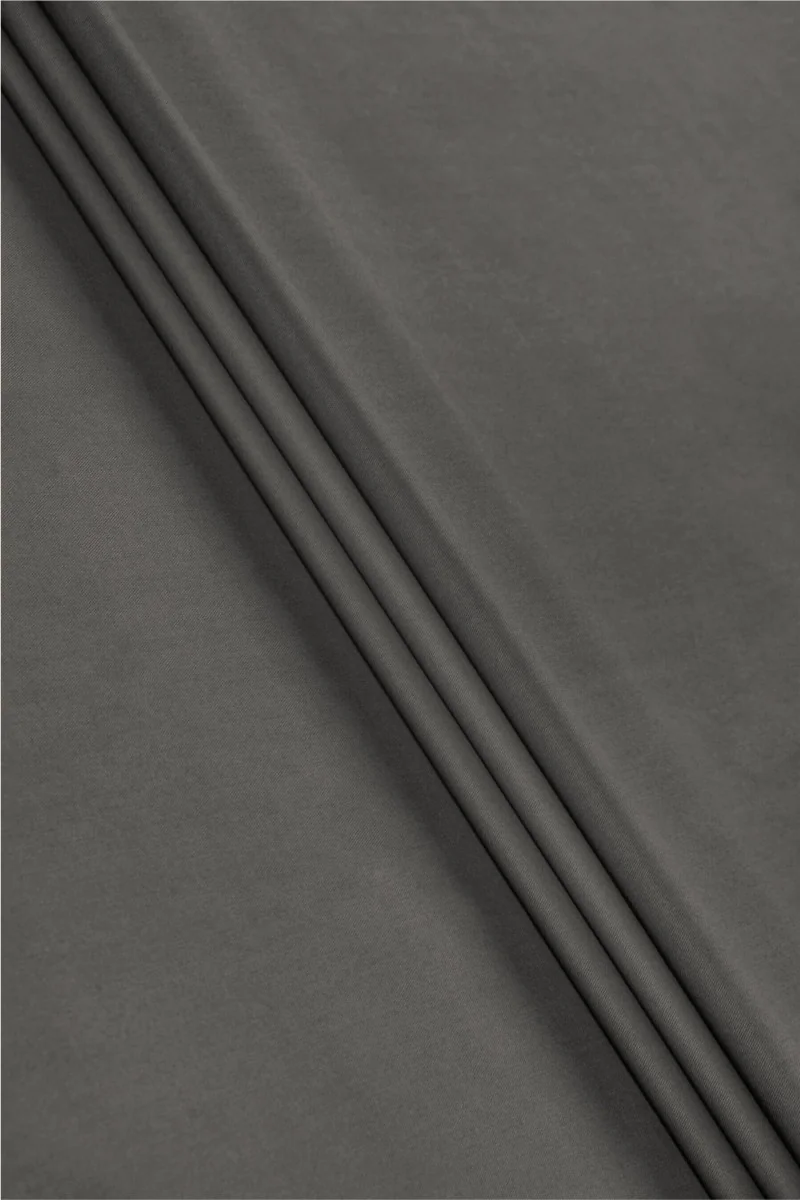 Tissu en coton italien gris, de couleur foncée. Le tissu est légèrement élastique, d’épaisseur moyenne avec un tissage sergé serré et délicat. Il est mat et repose assez rigide, tout comme les tissus en denim. Un tissu naturel de très bonne qualité, parfait pour coudre un pantalon, un katana, une jupe ainsi qu’une robe.