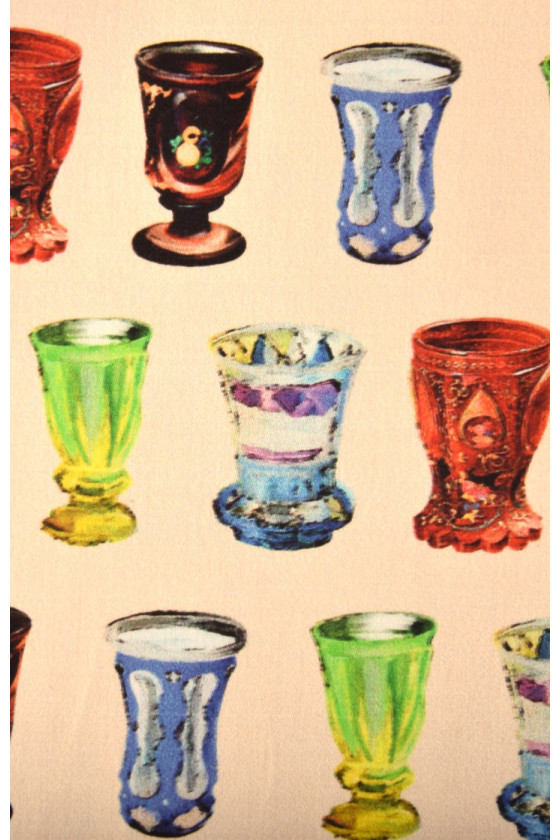 Un imprimé très intéressant des gobelets sur du coton légèrement élastique. Tissu opaque, épaisseur moyenne. Parfait pour les robes, les pantalons, les jupes.