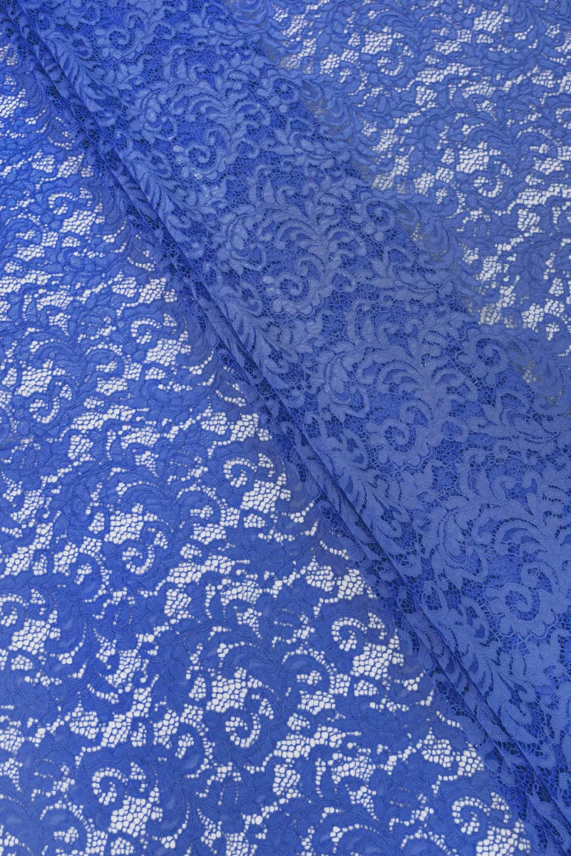 Dentelle italienne de couleur bleu denim. Le tissu a un motif floral dense relié à la maille et fini par un cordon. La couronne est finie avec une dent décorative des deux côtés - nous la cousons circonférentiellement. Une très belle proposition pour les personnes qui aiment les couleurs classiques et neutres.