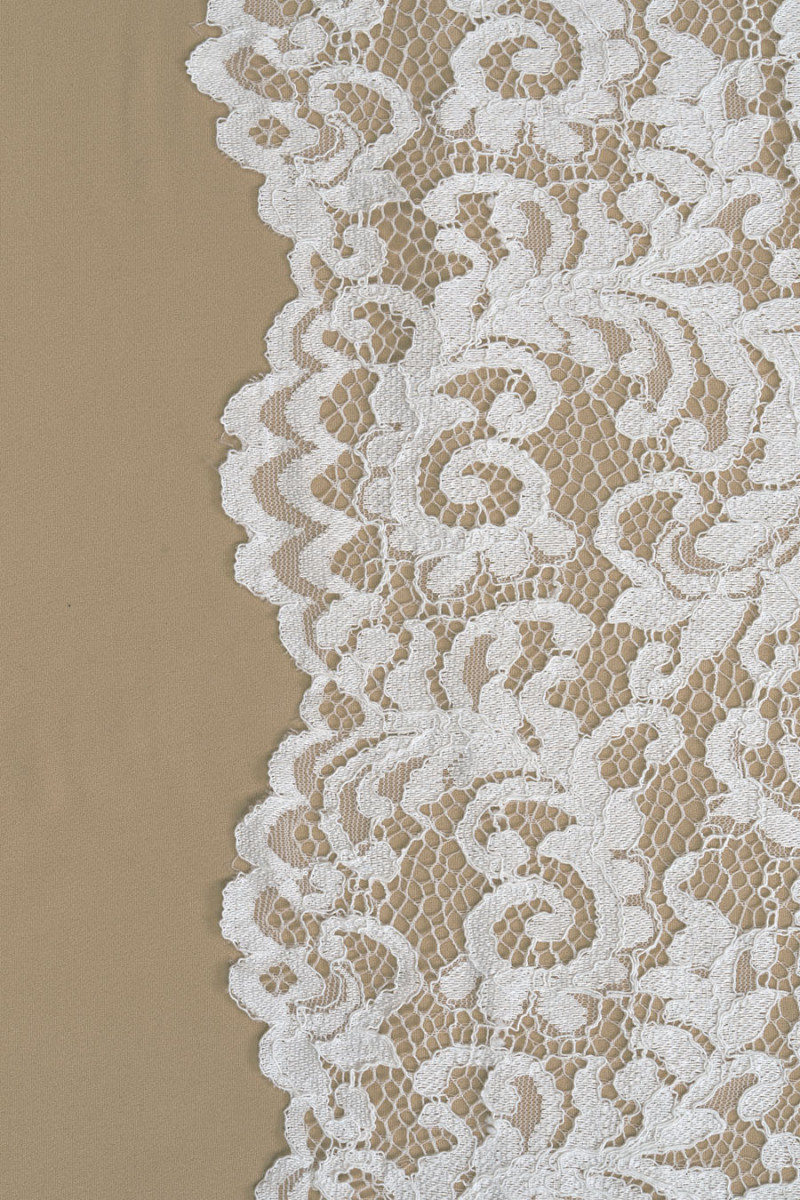 Dentelle italienne de couleur crème. Le tissu a un motif floral dense relié à la maille et fini par un cordon. La couronne est finie avec une dent décorative des deux côtés - nous la cousons circonférentiellement. Une très belle proposition pour les personnes qui aiment les couleurs vives mais pas blanches.