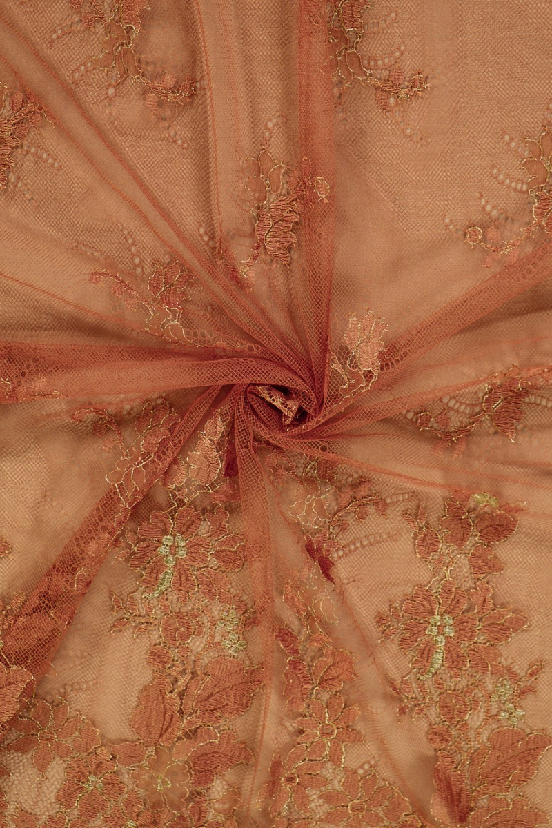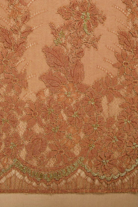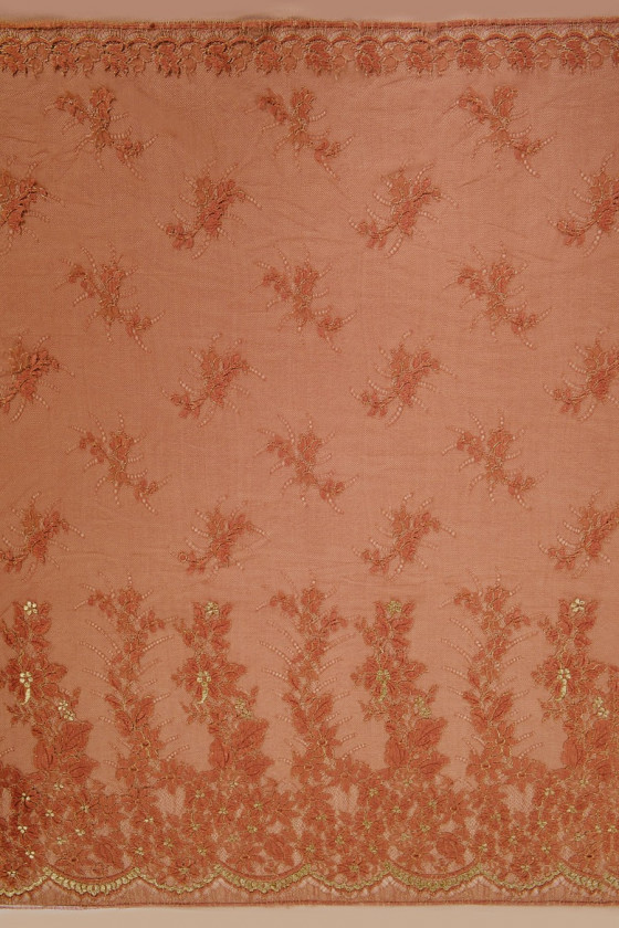 Belle dentelle rouge avec fil de lurex doré. Le tissu est fini des deux côtés avec une dent asymétrique (pour l’auto-coupe). Le motif se produit de manière périphérique. La dentelle mesure 95 cm de large.