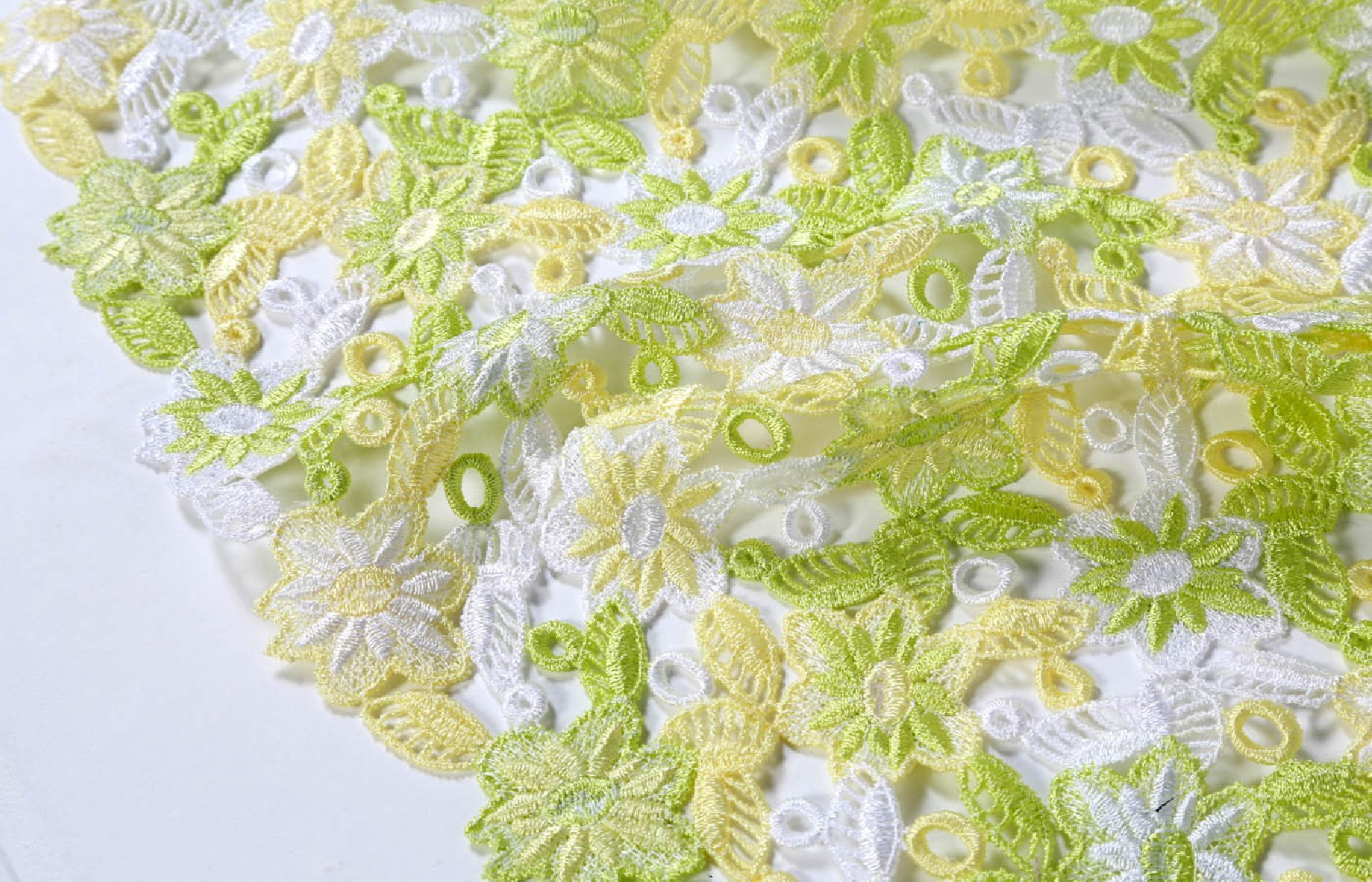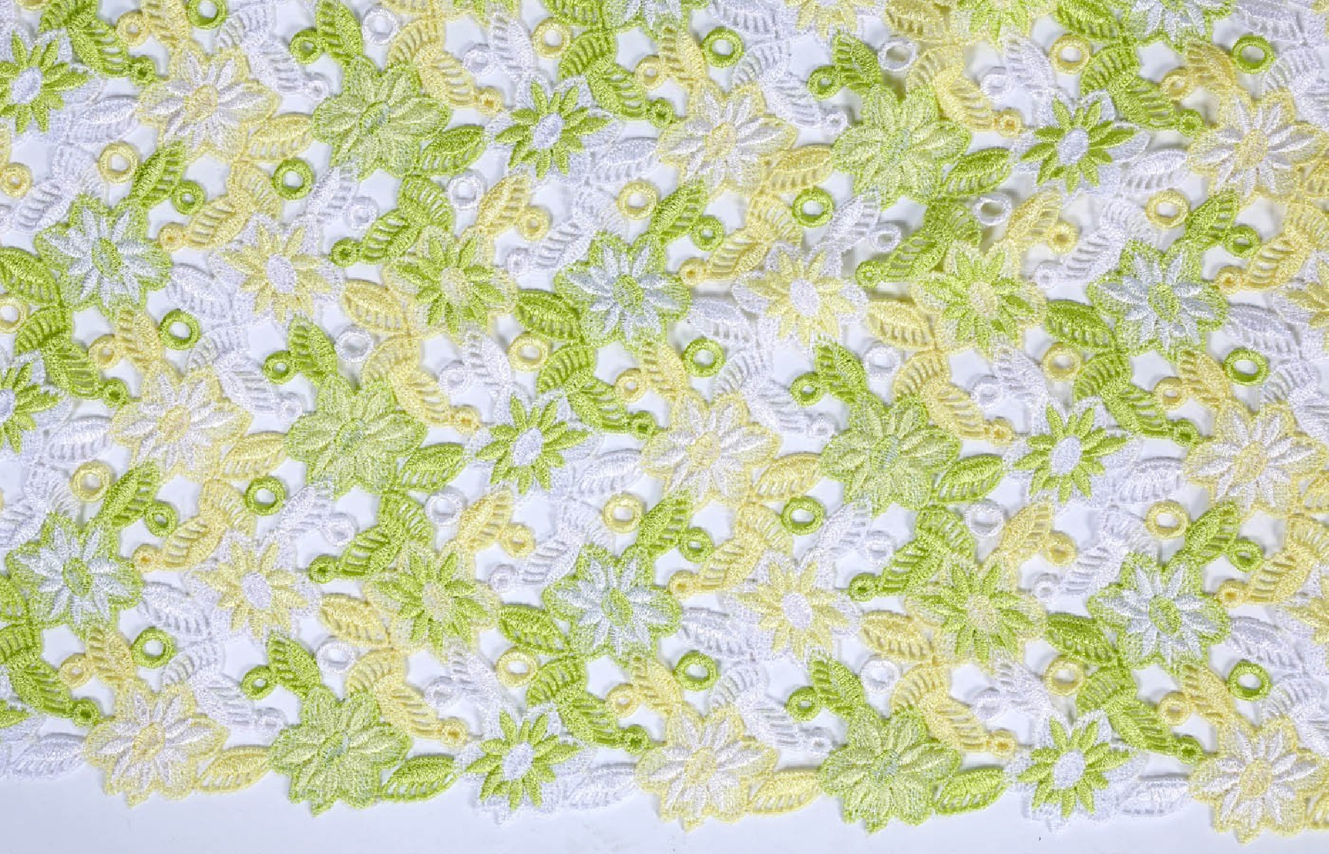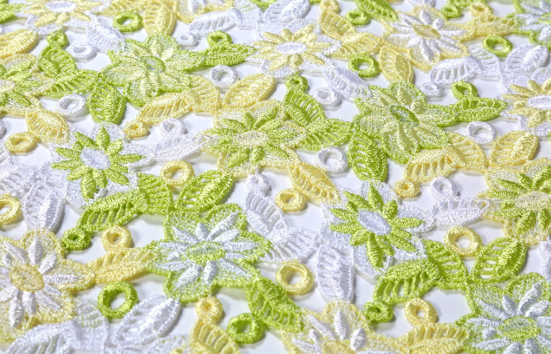 Belle dentelle guipure à motif floral. Les couleurs printanières lui donnent de la fraîcheur. Parfait pour les chemisiers ou les robes.