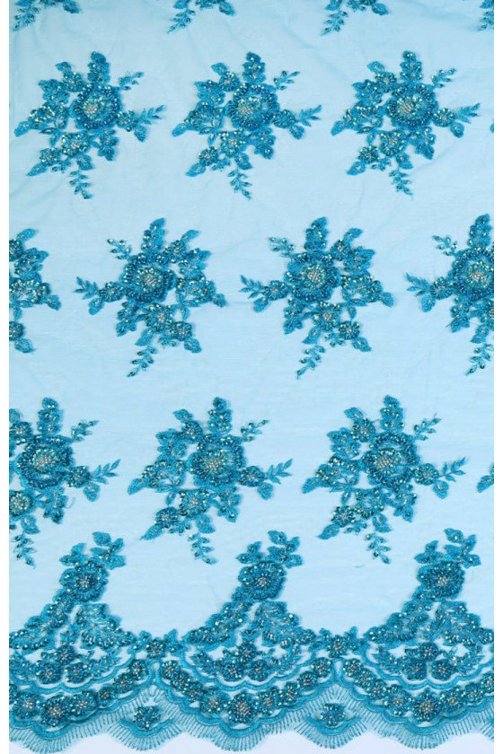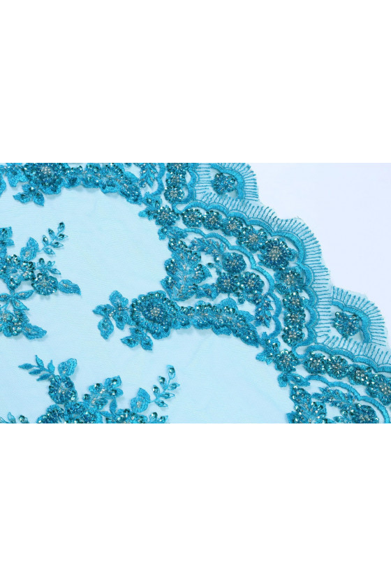 Belle dentelle brodée de perles. Le tissu est non élastique, lourd, fini des deux côtés avec une dent. Parfait pour les robes ou les chemisiers.