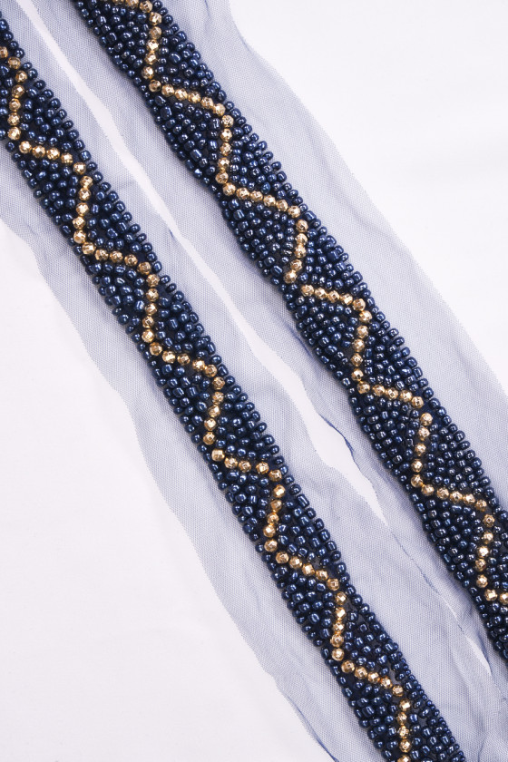 Ruban de mercerie italien bleu marine de 3,3 cm de large richement décoré de perles. Le ruban est composé de deux types de perles bleu marine et dorées qui forment un zigzag. L’ensemble est cousu sur une maille en tulle bleu marine. Une belle proposition pour décorer une robe, un chemisier ou une jupe élégants.
