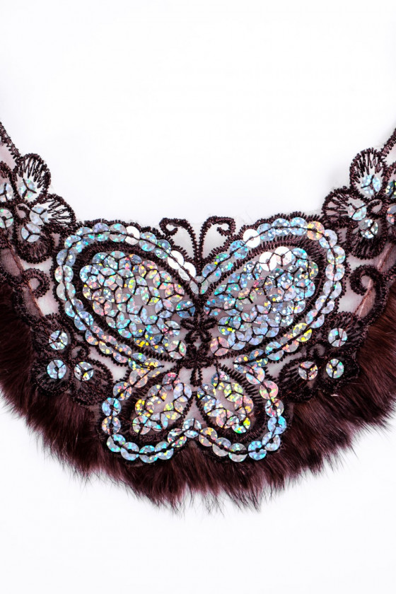 Appliqué à l’encolure papillon - brodé de sequins avec fourrure marron naturelle. Hauteur 25 cm, largeur 10 - 28 cm.