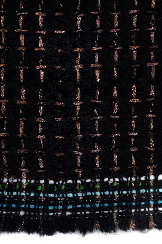Tissu de costume Chanel italien noir avec un motif à carreaux, décoré de fil de lurex cuivré. Tissu plus épais avec un tissage serré.