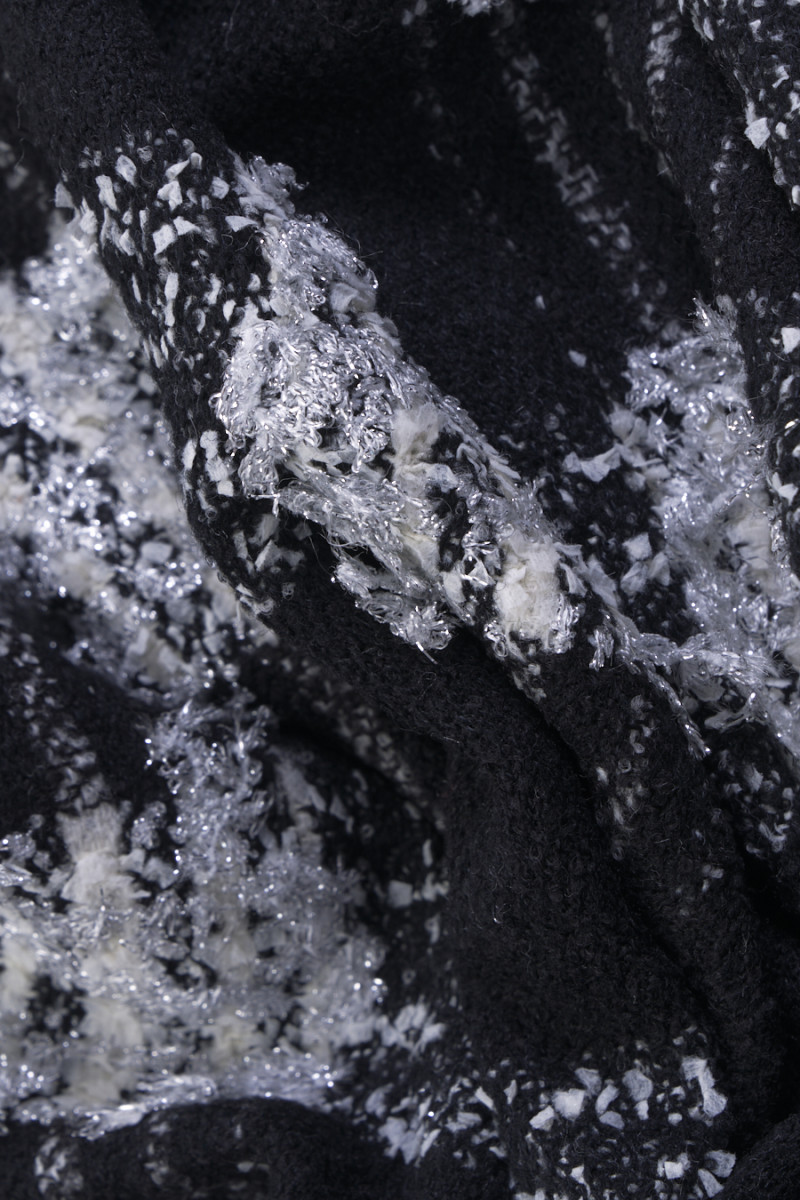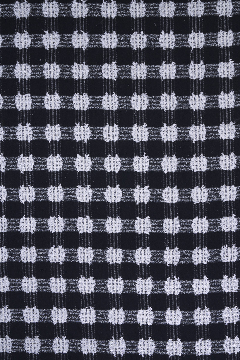 Tissu de costume Chanel italien en noir avec fil écru et pompons argentés. Un tissu à la structure convexe et au tissage serré avec un motif à carreaux de 5 cm. Le tissu a été délicatement décoré d’un fil brillant, ce qui lui ajoute de l’élégance. Le tissu est composé principalement de fibres naturelles, il est donc très confortable à porter, et l’ajout de fil synthétique le rend plus durable et ne se froisse pas. Une proposition fantastique pour les fans de vêtements en tweed aux couleurs intemporelles et aux motifs toujours à la mode.