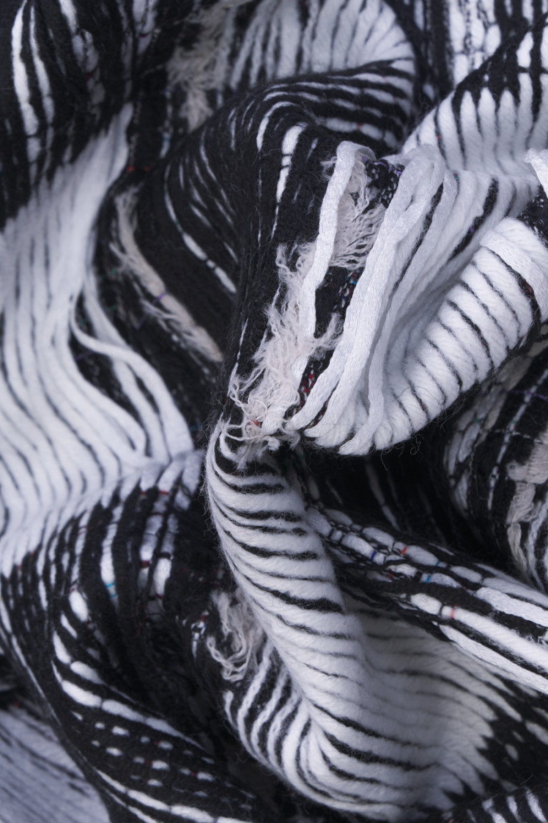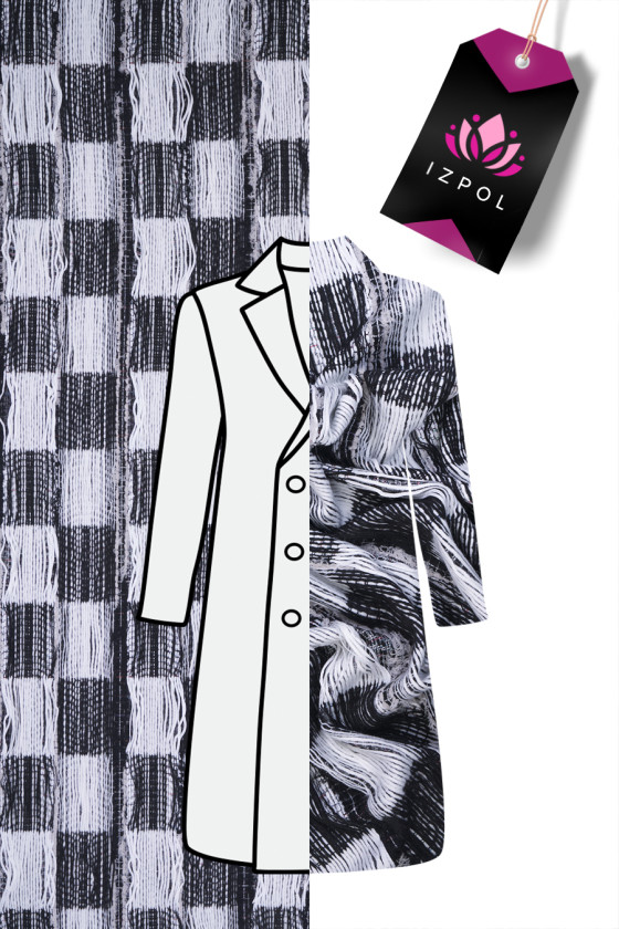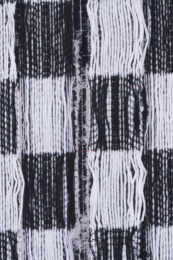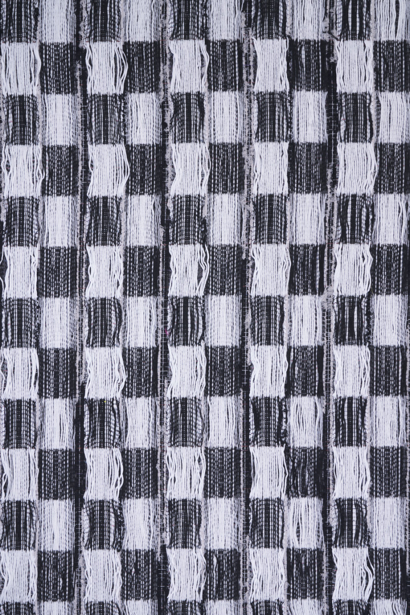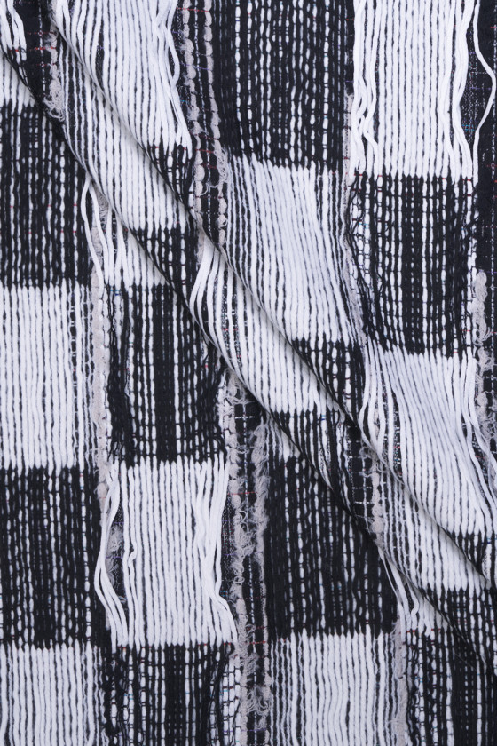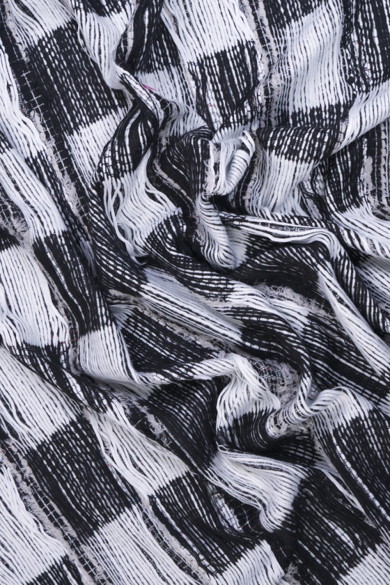 Tissu de costume Chanel italien en noir avec fil écru. Un tissu à structure convexe et au tissage serré avec un motif à carreaux de +- 11 cm. Le tissu a des entrelacs lâches qui peuvent être coupés librement, grâce auxquels nous obtiendrons l’effet de franges. Cette procédure vous permet de créer des projets individuels selon vos préférences. Une proposition fantastique pour les fans de vêtements en tweed aux couleurs intemporelles et aux motifs toujours à la mode, et pour les personnes qui apprécient les vêtements uniques. Dans ce tissu, vous n’êtes limité que par votre imagination - créez quelque chose spécialement pour vous-même.