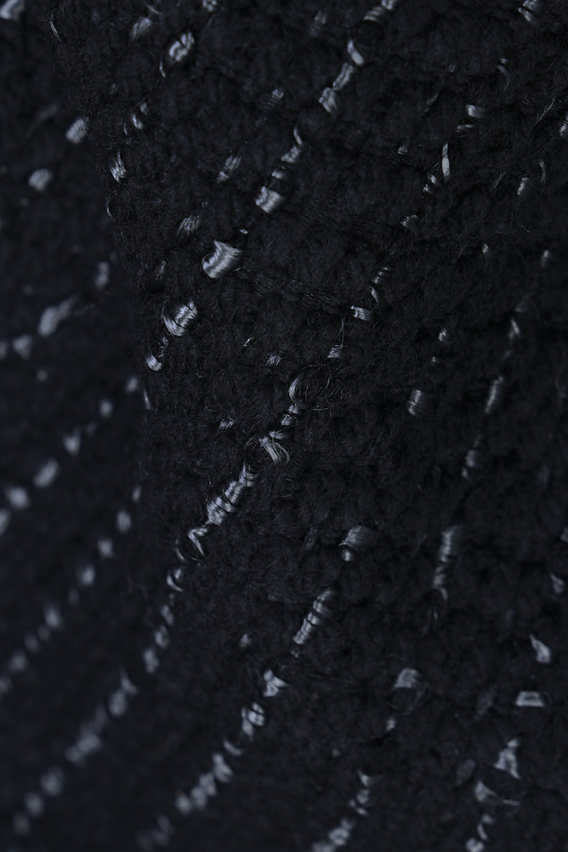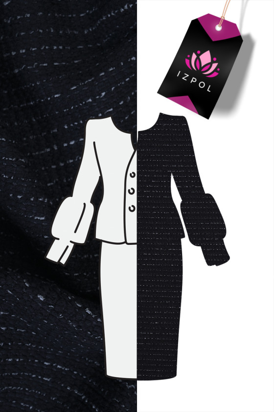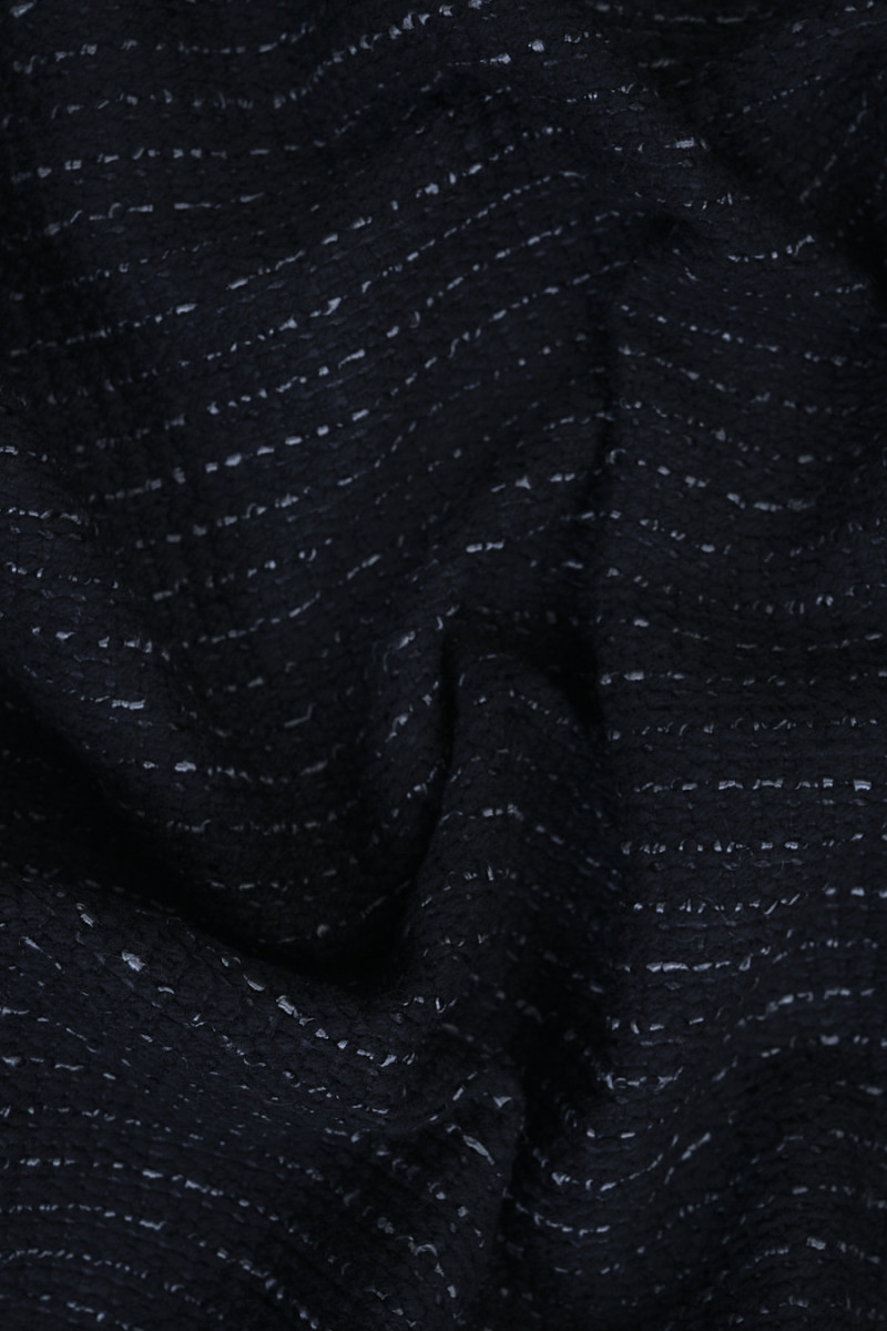 Tissu de costume italien automne-hiver en noir tissé à partir de laine naturelle avec un mélange de viscose et d’acrylique. Le tissu a des coutures horizontales grises qui créent des rayures délicates de 1,5 cm de large. La combinaison de fibres naturelles et de fibres synthétiques rend le tissu chaud, mais en même temps solide et durable. Une proposition parfaite pour coudre un costume, une veste ou une robe d’automne.