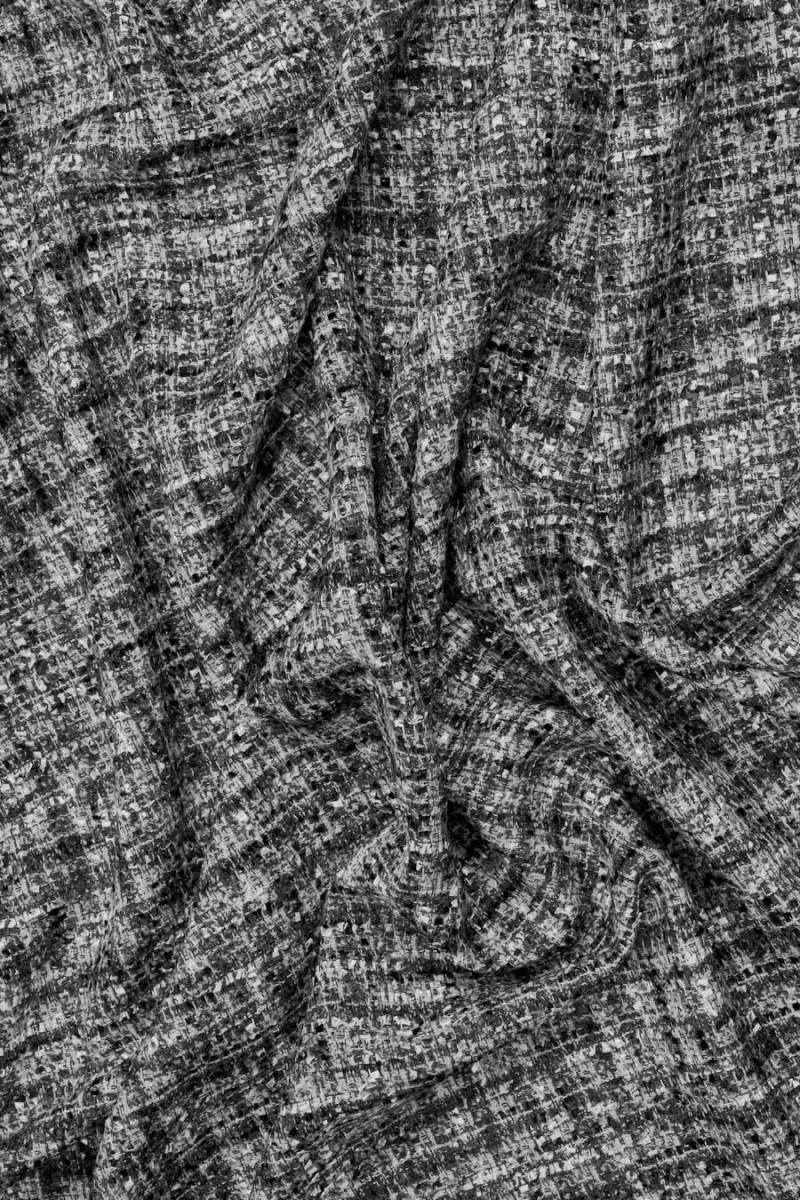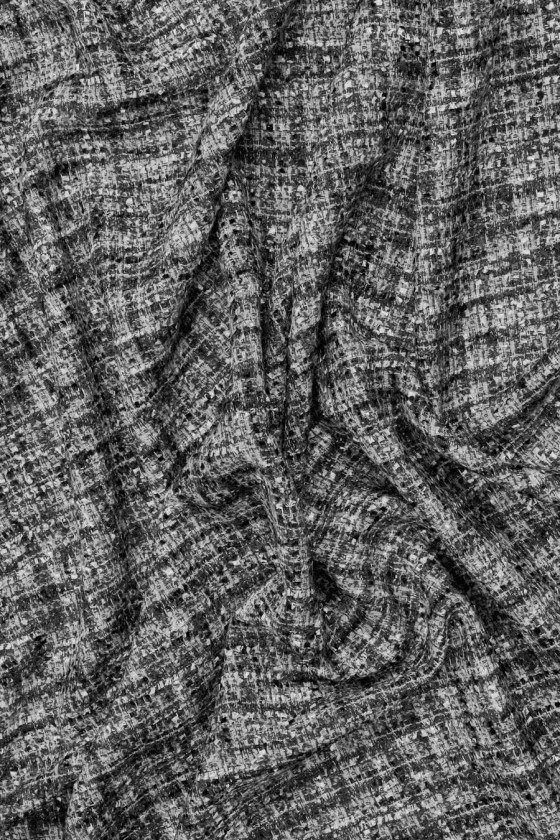 Tissu de costume Chanel italien dans les tons de gris, noir et crème. Un tissu au tissage plus lâche, fini avec des fils légèrement saillants qui ressemblent à de minuscules franges, composé principalement de fibres naturelles, c’est pourquoi il est très agréable à porter, doux et inélastique. Il est parfait pour coudre des vêtements élégants et quotidiens. Une excellente proposition pour les amateurs de tissus en tweed aux couleurs intemporelles.