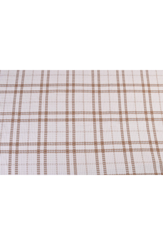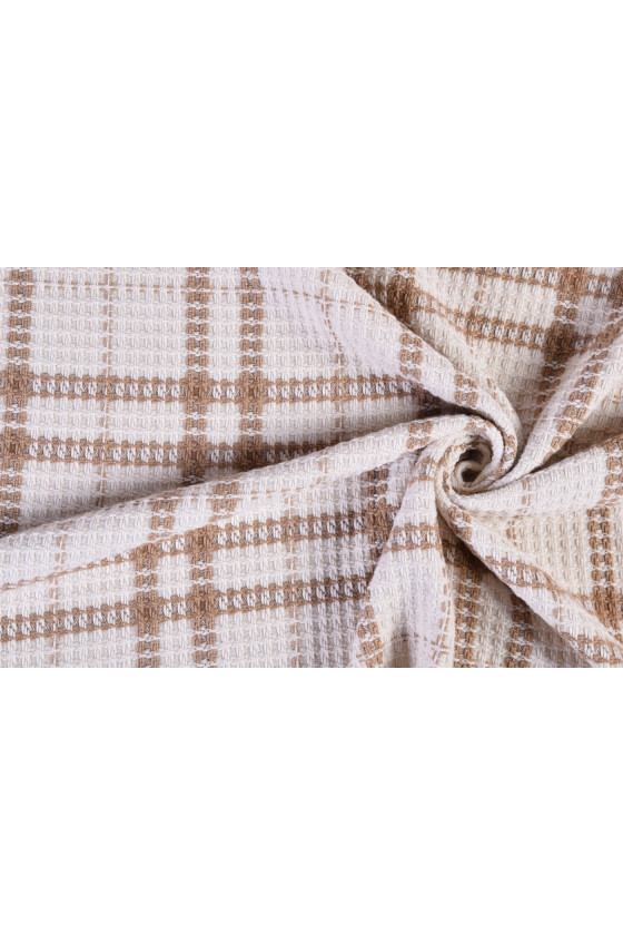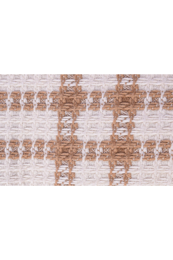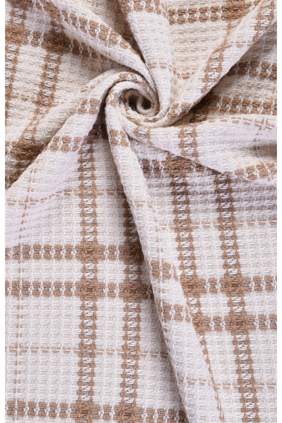Tissu de costume Chanel italien en écru avec un motif d’un grand carreau beige, de 25 cm de large. Le tissu a des coutures très intéressantes qui rendent sa texture plus convexe et ressemblent à une structure « gaufrée ». Le tissu est composé de viscose et de polyester. Une proposition parfaite pour coudre un costume ou un manteau fin pour les fans de vêtements en tweed.