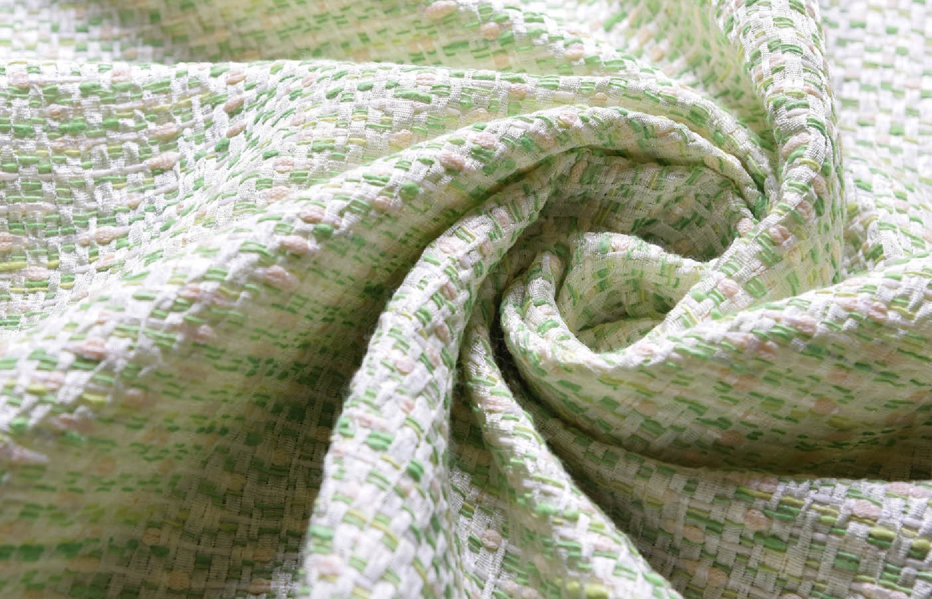 Tissu déguisement Chanel vert pastel et écru, épaisseur moyenne. Parfait pour les vestes, les robes, les manteaux de transition.