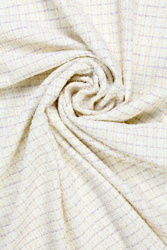 Tissu déguisement Chanel aux couleurs pastel orange, violet et blanc pour costumes, jupes ou robes. Le tissu est stable et nécessite une doublure.