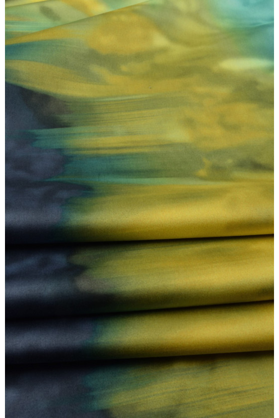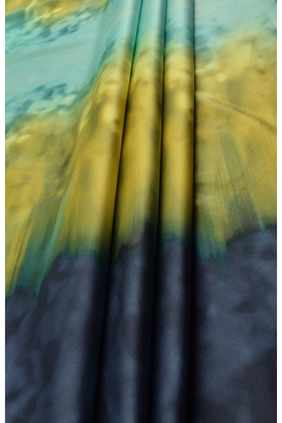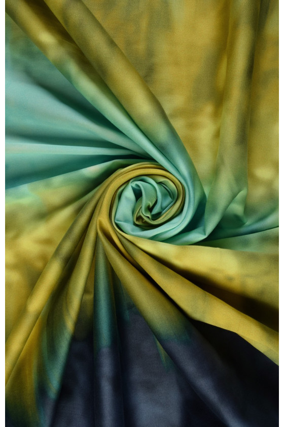 Élastique en coton plus épais avec des rayures dégradées - bleu marine, jaune et turquoise. Nous le recommandons pour coudre des robes, des jupes et même des costumes d’été.