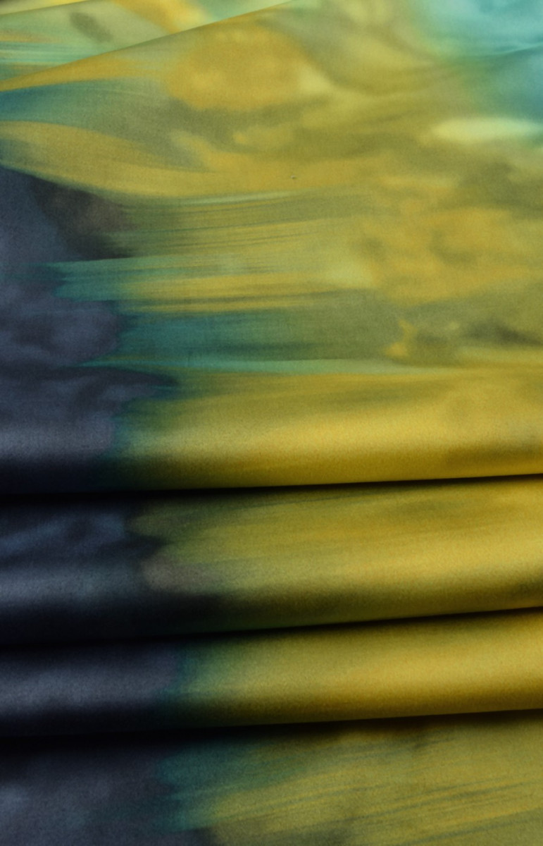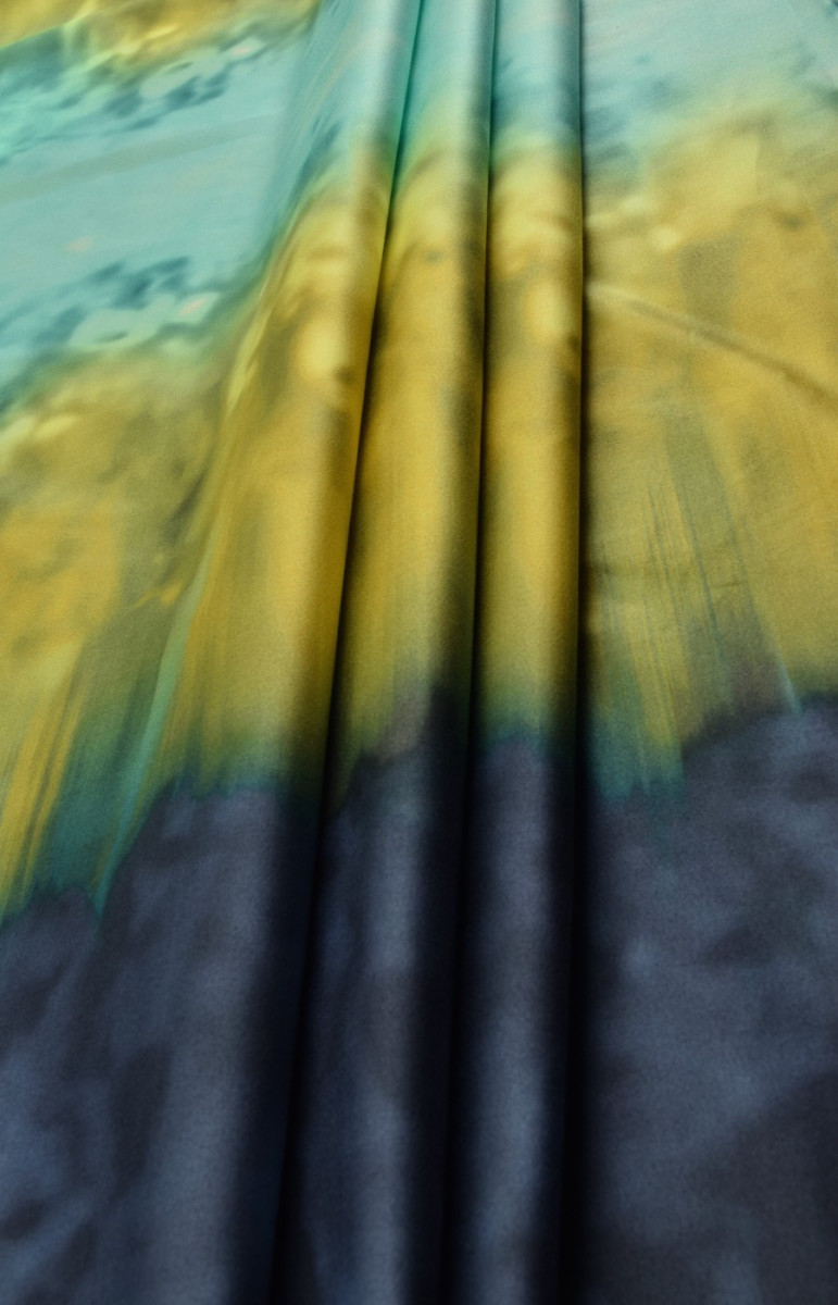 Élastique en coton plus épais avec des rayures ombrées - bleu marine, jaune et turquoise. Nous le recommandons pour coudre des robes, des jupes et même des costumes d’été. Remarque! Le tissu peut présenter des défauts mineurs.