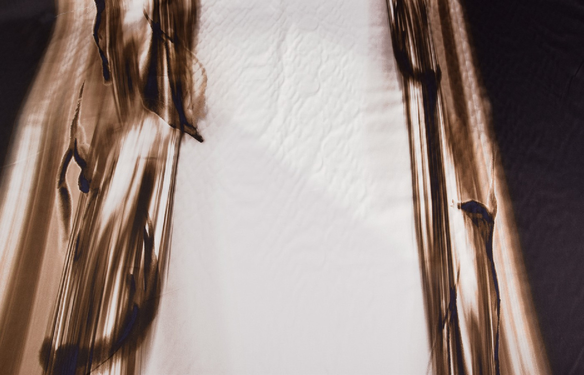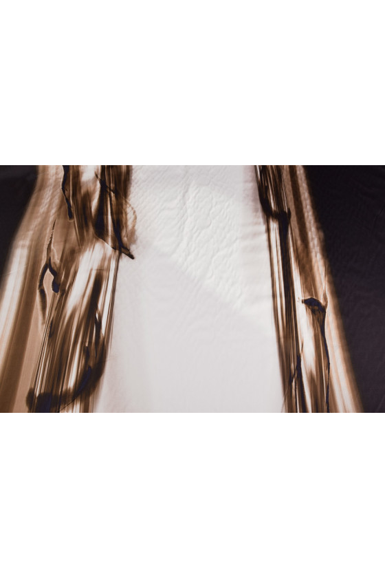 Coton plus épais avec de l’élasthanne à rayures irrégulières en beige et brun foncé. Sur fond de rayures, les silhouettes des dauphins s’estompent.