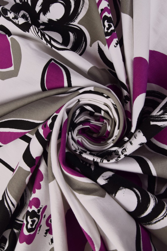 Coton imprimé, élastique, plus épais avec un grand motif peint de fleurs. Couleurs : fleurs en violet, noir et beige olive sur écru.