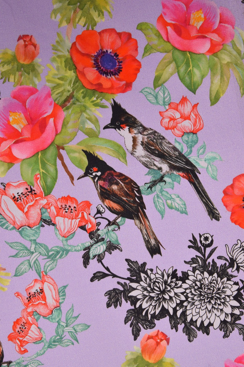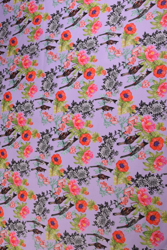 Coton italien, de très bonne qualité, élastique. Sur un fond violet clair, il y a des fleurs colorées avec des oiseaux (environ 8 cm). Nous le recommandons pour coudre des robes et des jupes. pantalons, vestes