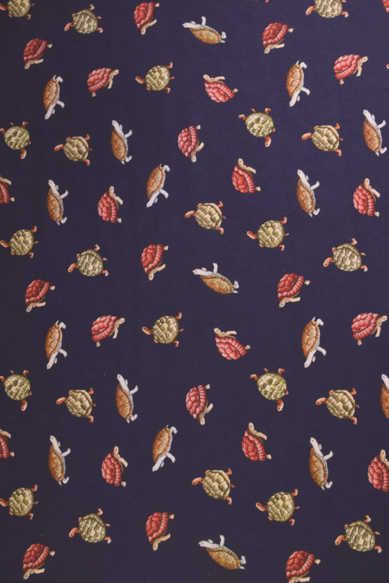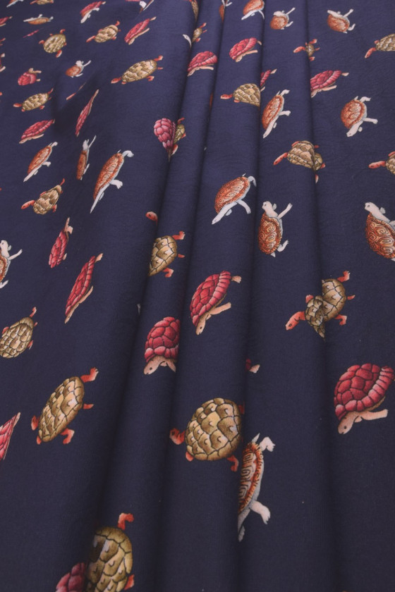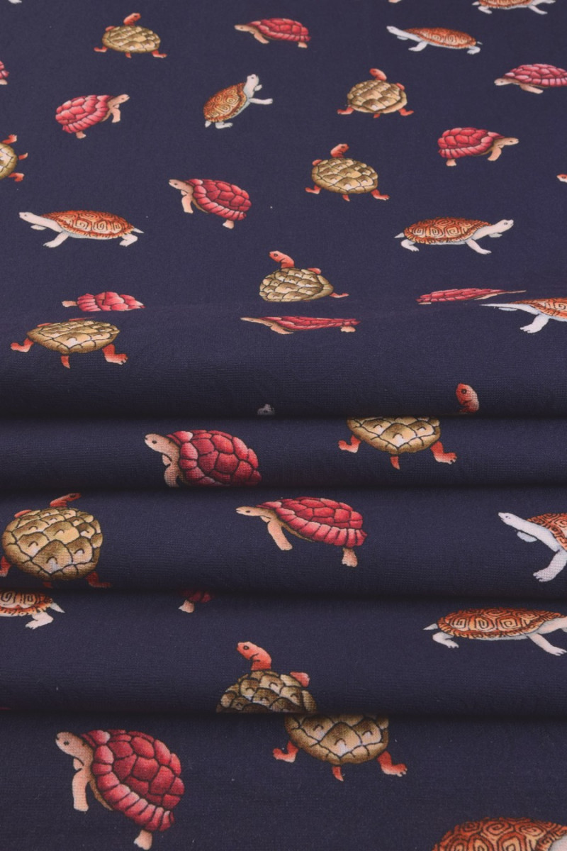 Coton jacquard bleu marine plus épais avec un imprimé de tortues colorées (taille environ 3,5-4 cm). Nous le recommandons pour coudre des robes, des pantalons, des jupes, des vestes.
