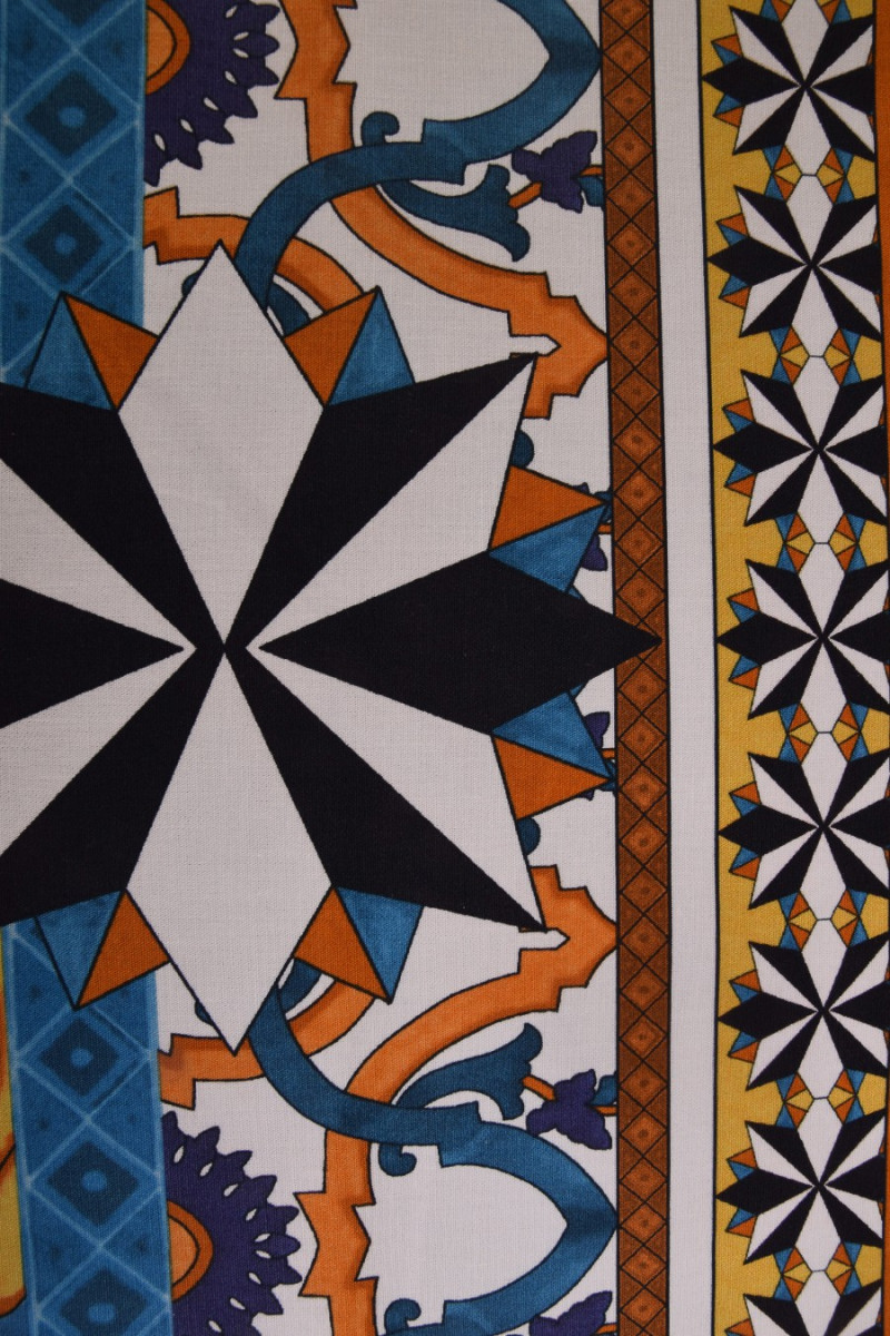 Tissu en coton italien d’une taille de coupon 130cm*140cm. Un motif oriental très intéressant en noir, jaune et bleu.