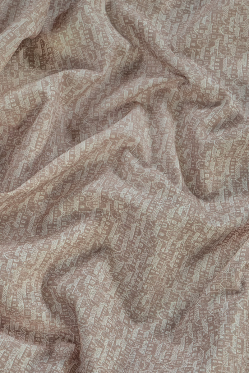 Chemise italienne en coton beige avec un motif de petites maisons. Tissu non élastique à tissage satiné, opaque, peu froissé. Parfait pour coudre une chemise, un chemisier, une robe ou une jupe.