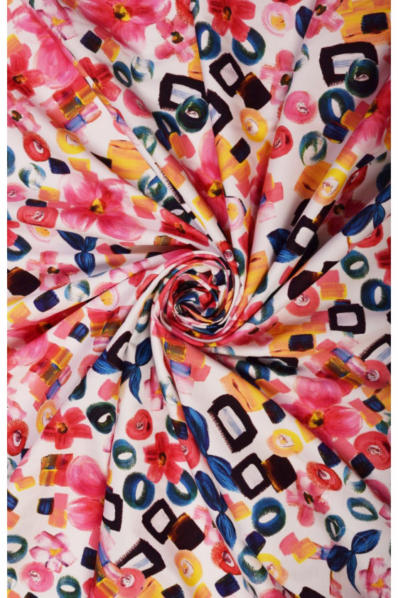 Beau coton à motifs. Tissu d’épaisseur moyenne, légèrement élastique. Parfait pour les robes, les pantalons, les ensembles printaniers.