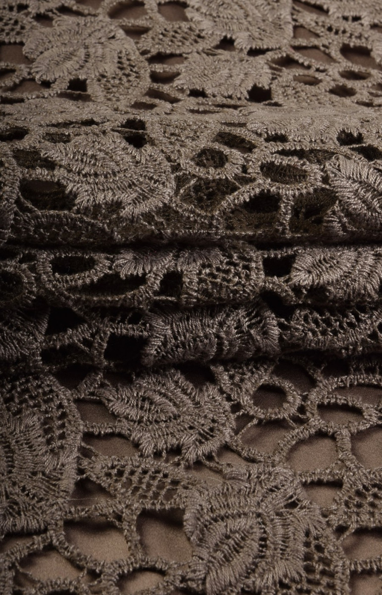 Le dernier coupon de dentelle guipure de couleur brun terreux. Avec une dent décorative des deux côtés. Coupon avec des dimensions de 70 cm * 140 cm.