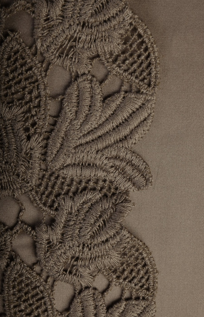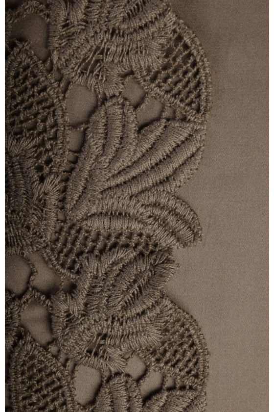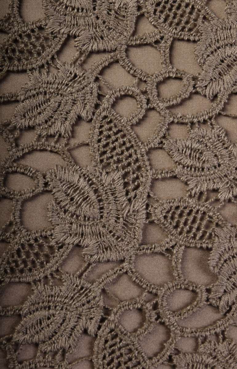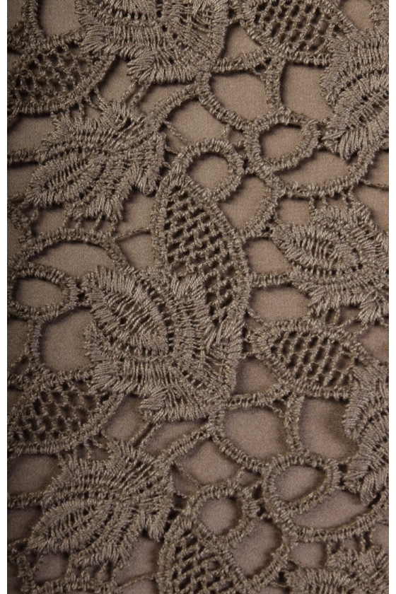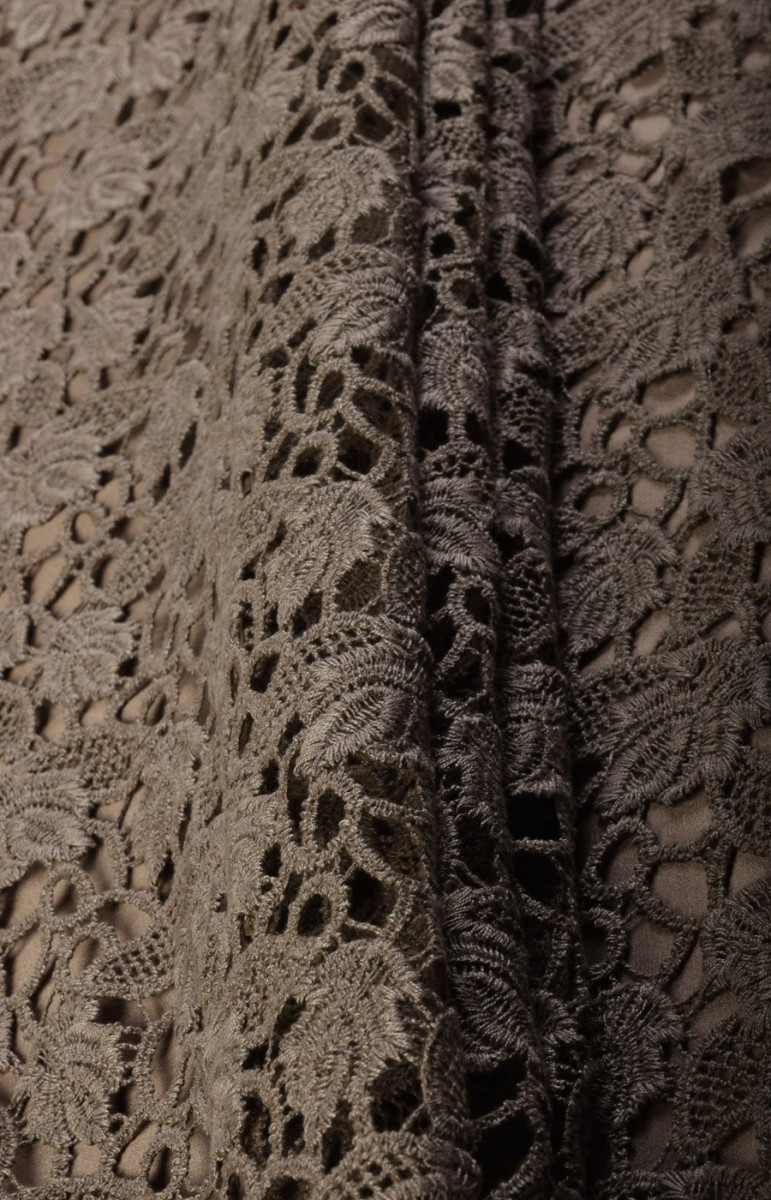 Le dernier coupon de dentelle guipure de couleur brun terreux. Des deux côtés, il se termine par une dent décorative avec un motif floral. Parfait pour coudre un chemisier ou une jupe.