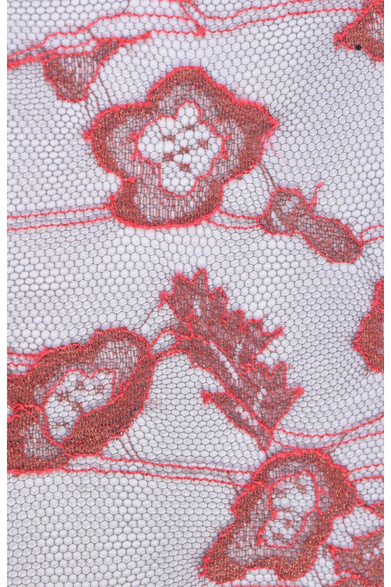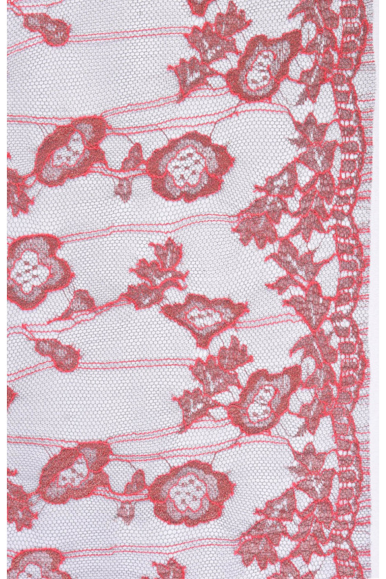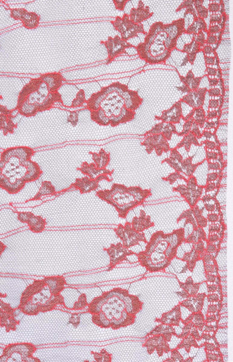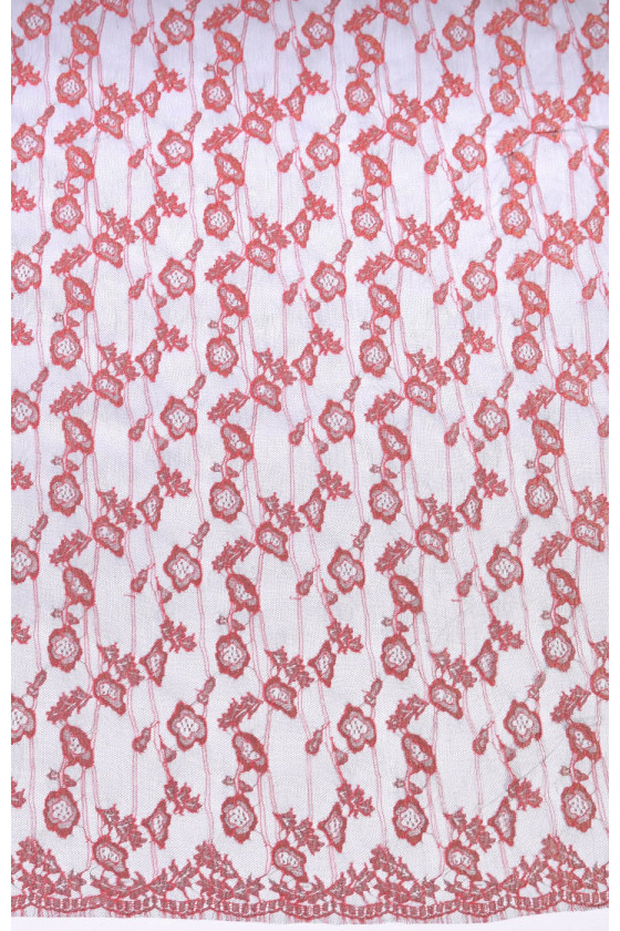 Dentelle fine et délicate bordeaux clair et rose sur tulle noir. Fini avec une dent des deux côtés. Tissu délicat. Parfait pour les chemisiers, les robes.