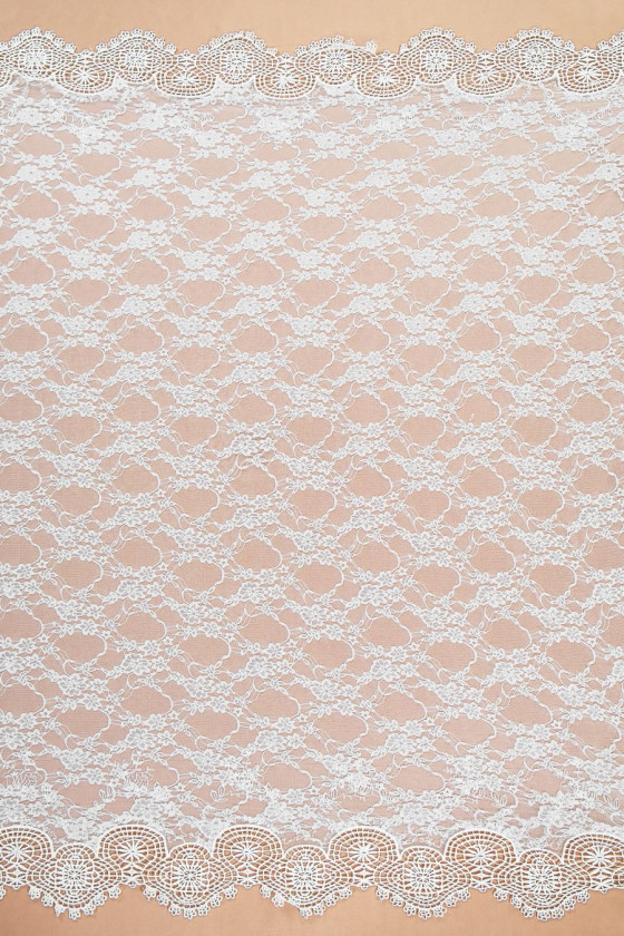 Belle dentelle élastique blanc cassé avec un motif floral. La couronne est finie des deux côtés avec une dent en guipure. Parfait pour coudre une robe de mariée, un chemisier de style bohème.