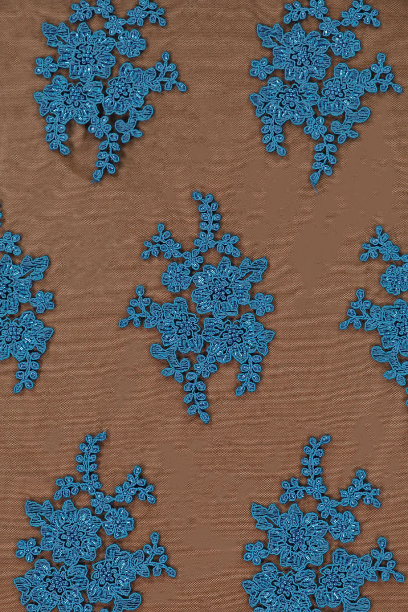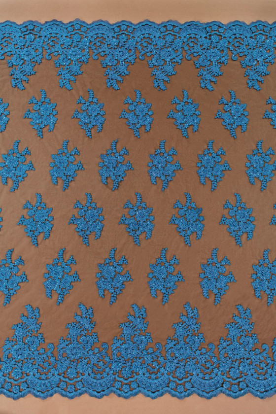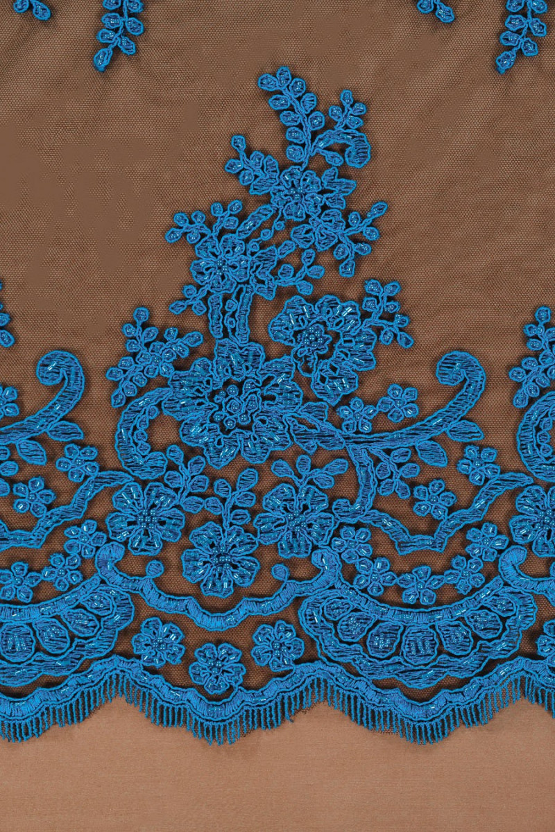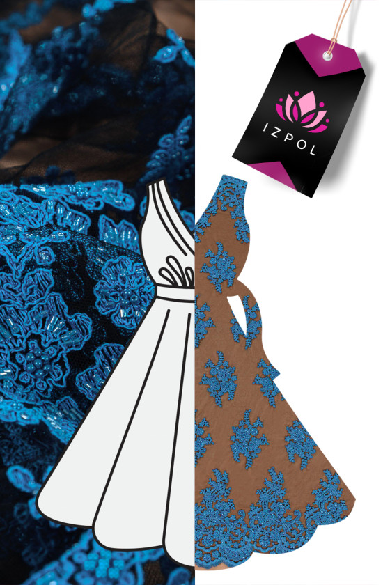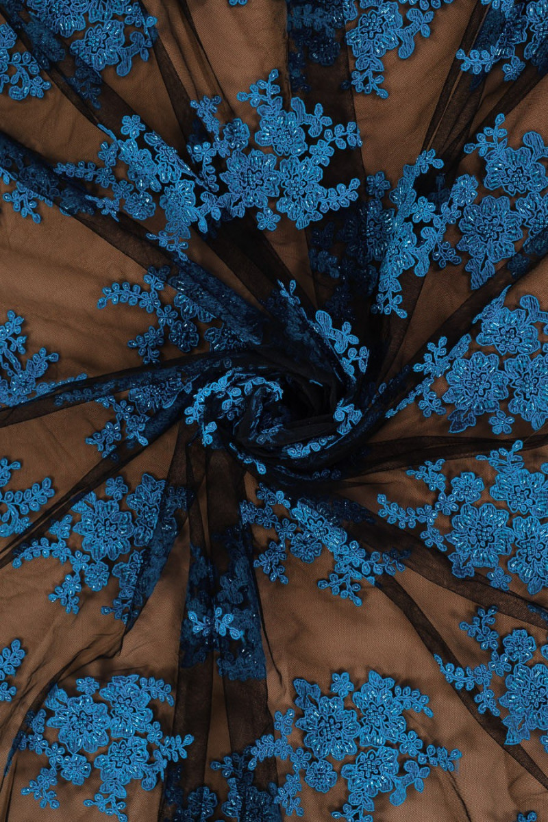Belle dentelle - broderie bleue sur tulle noir, richement décorée, finie avec une dent des deux côtés. Parfait pour les robes de soirée.
