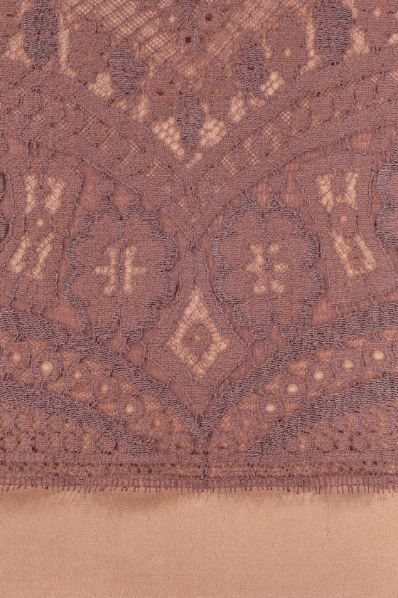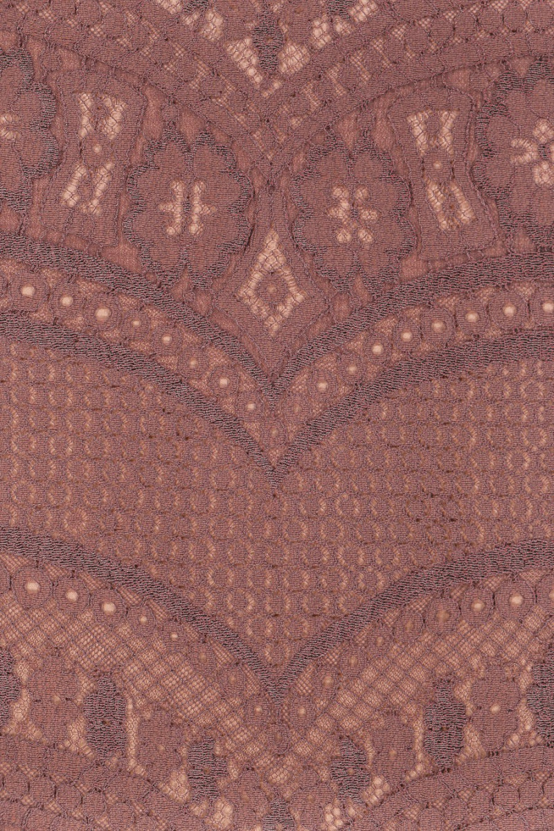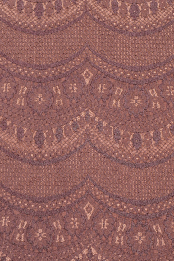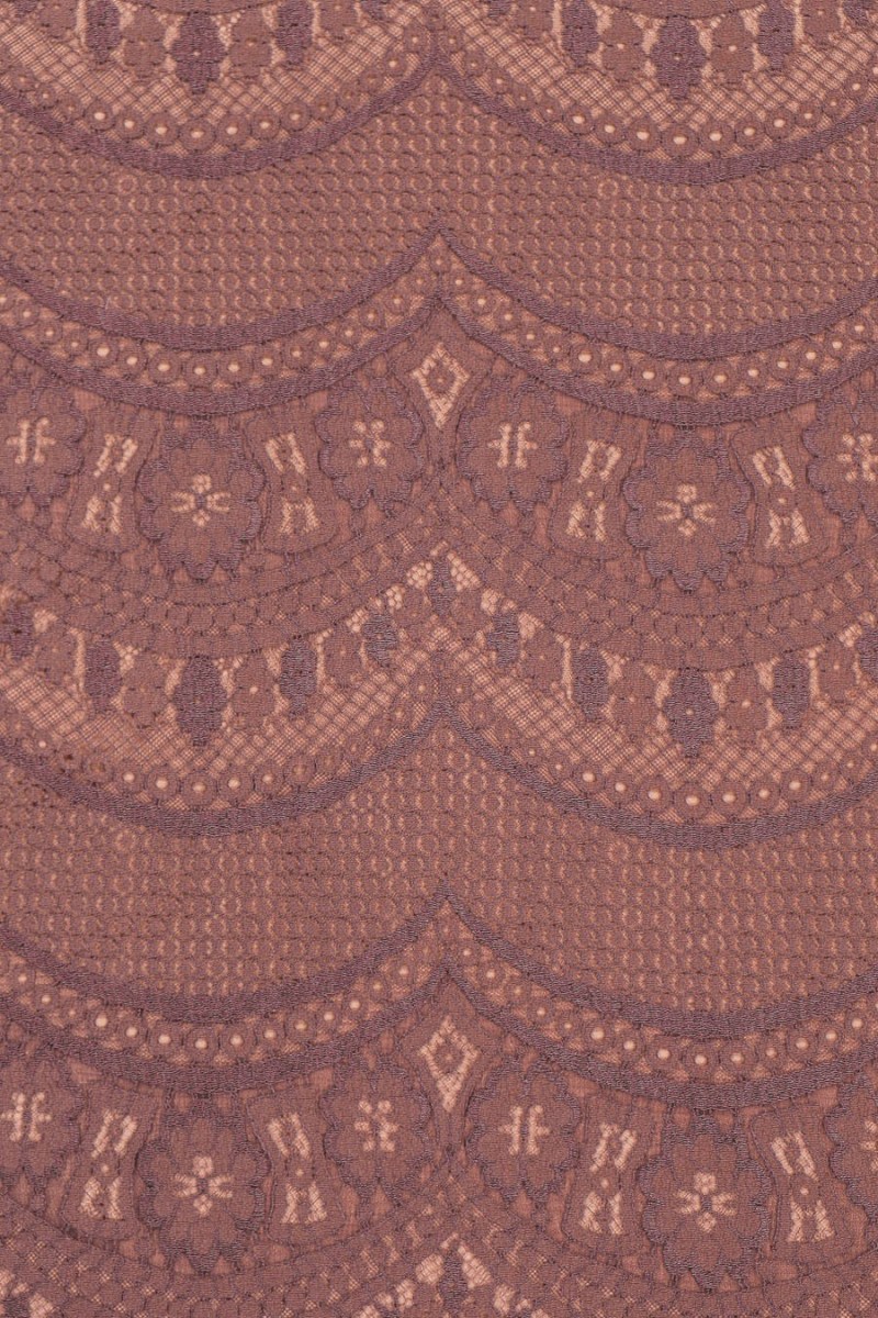 Belle dentelle française en bordeaux-brun. Un motif très intéressant de vagues et de fleurs. La dentelle est étroite (90 cm de large), le motif se produit circonférentiellement. Fini des deux côtés avec une dent - pour l’auto-excision.