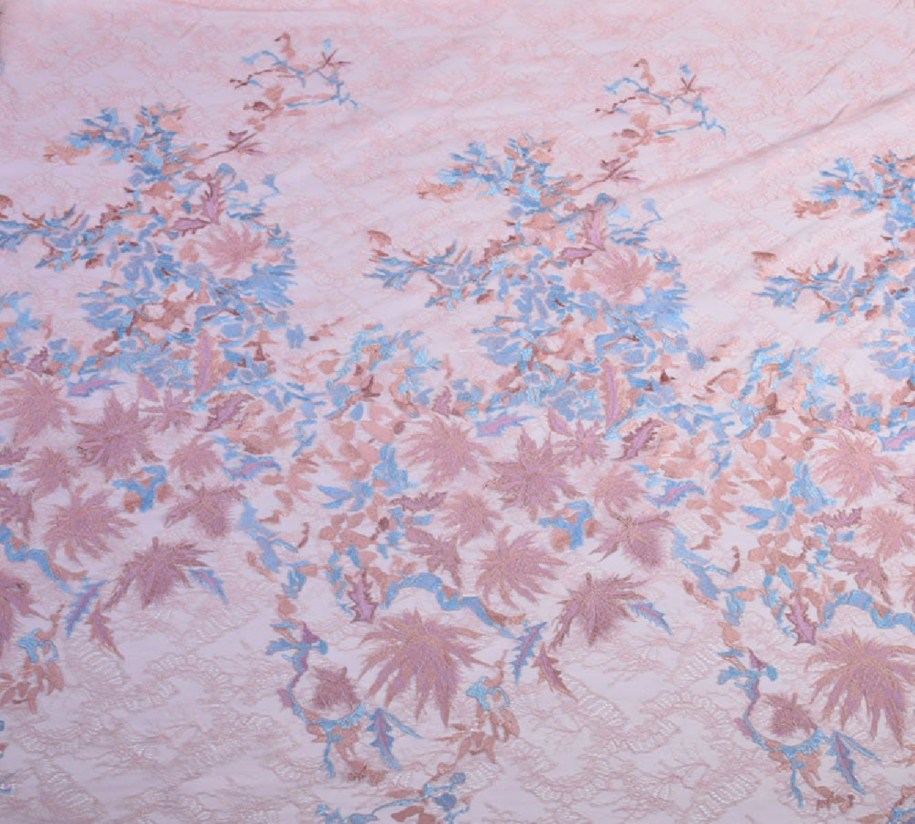 Belle dentelle en rose poudré et bleu avec broderie créant un effet 3D. Tissu de 140 cm de large. Il est doux et délicat. Parfait pour les robes ou les chemisiers.