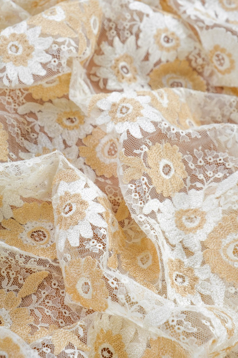 Dentelle de 80 cm de large avec fleurs écrues brodées et beige. Nous le recommandons pour coudre des corsets, des chemisiers ou pour des inserts.