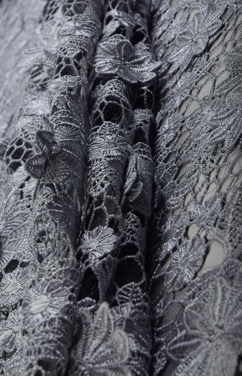Dentelle guipure 3D de couleur gris argenté avec des fleurs cousues lâchement, très impressionnante. Pour un bel effet, nous vous recommandons de choisir une doublure, par exemple en satin.