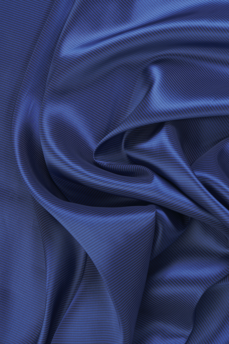 Doublure italienne 100% viscose bleu marine avec un motif rayé noir et marron. Le tissu est non élastique avec une brillance très noble. Sa composition entièrement naturelle le rend parfait comme doublure pour une veste ou un manteau.