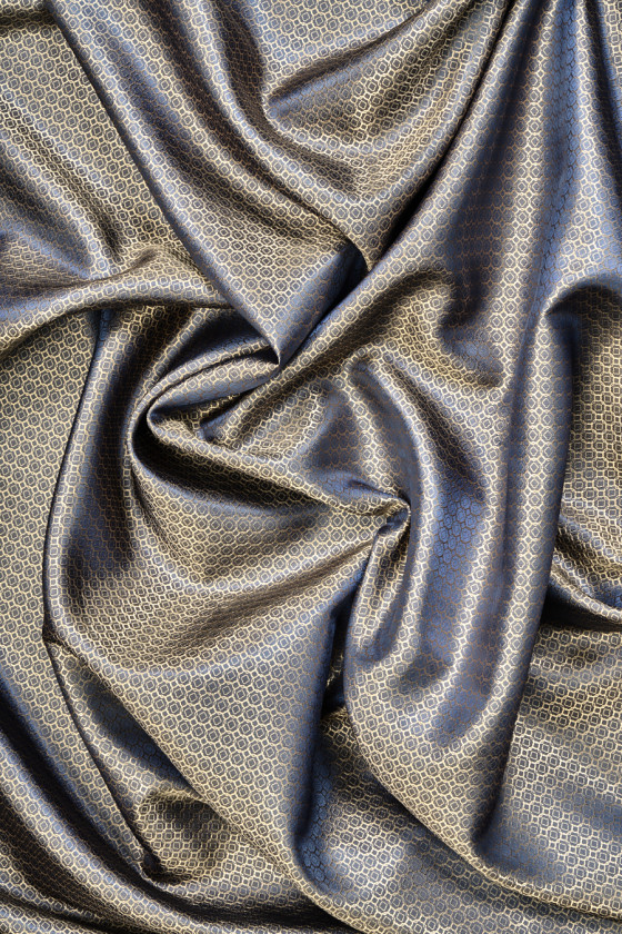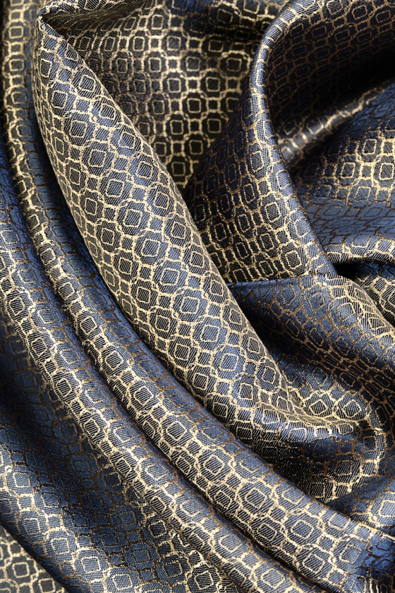 Doublure en jacquard italien composée de deux couleurs de fils, l’or et le bleu marine, qui créent un effet bicolore. Tissu avec un motif dense de petits motifs géométriques ressemblant à des diamants d’une largeur de 0,5 cm. La doublure est non élastique avec une brillance très noble, elle peut être cousue des deux côtés. Sa composition naturelle le rend parfait comme doublure pour une veste ou un manteau. Une proposition fantastique pour les personnes qui aiment les doublures intéressantes et originales.