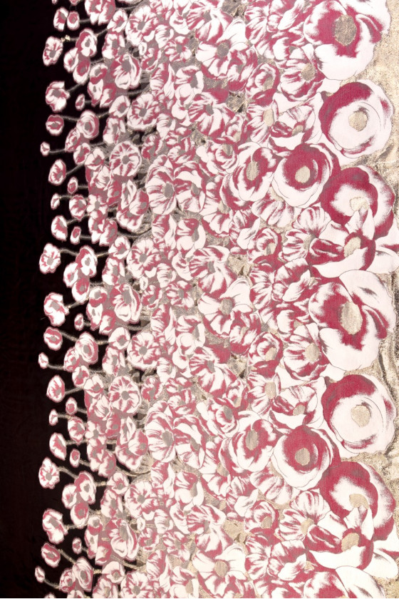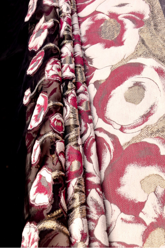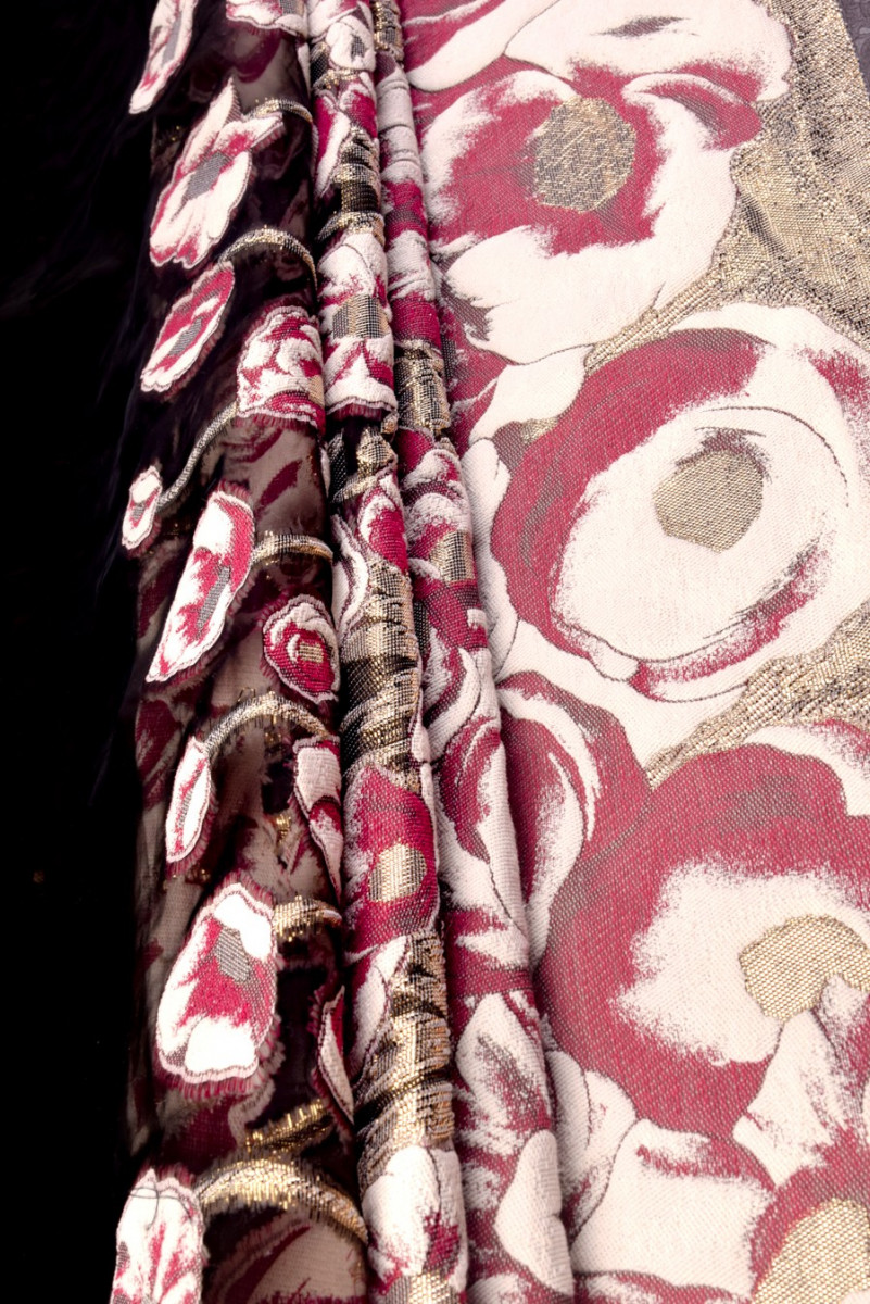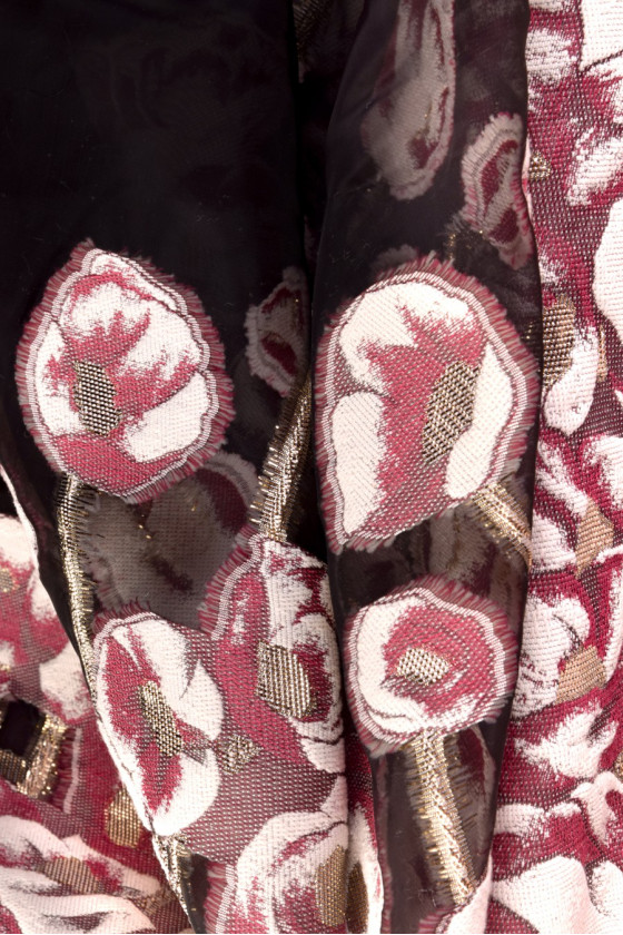 Jacquard avec un motif de grandes fleurs en croissance rose, écru et or, dessus en tissu en organza noir transparent. Tissu destiné aux robes et jupes. Longueur du coupon 140*90cm. S’il vous plaît nettoyage à sec !