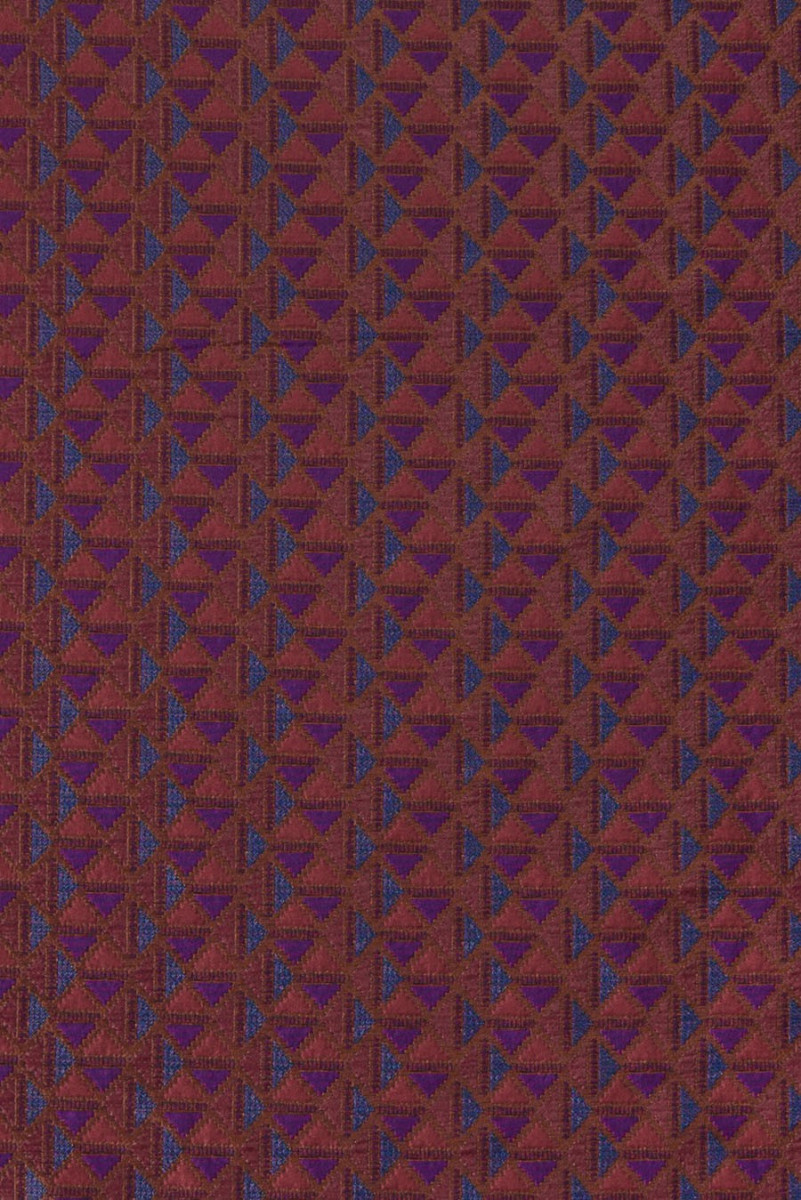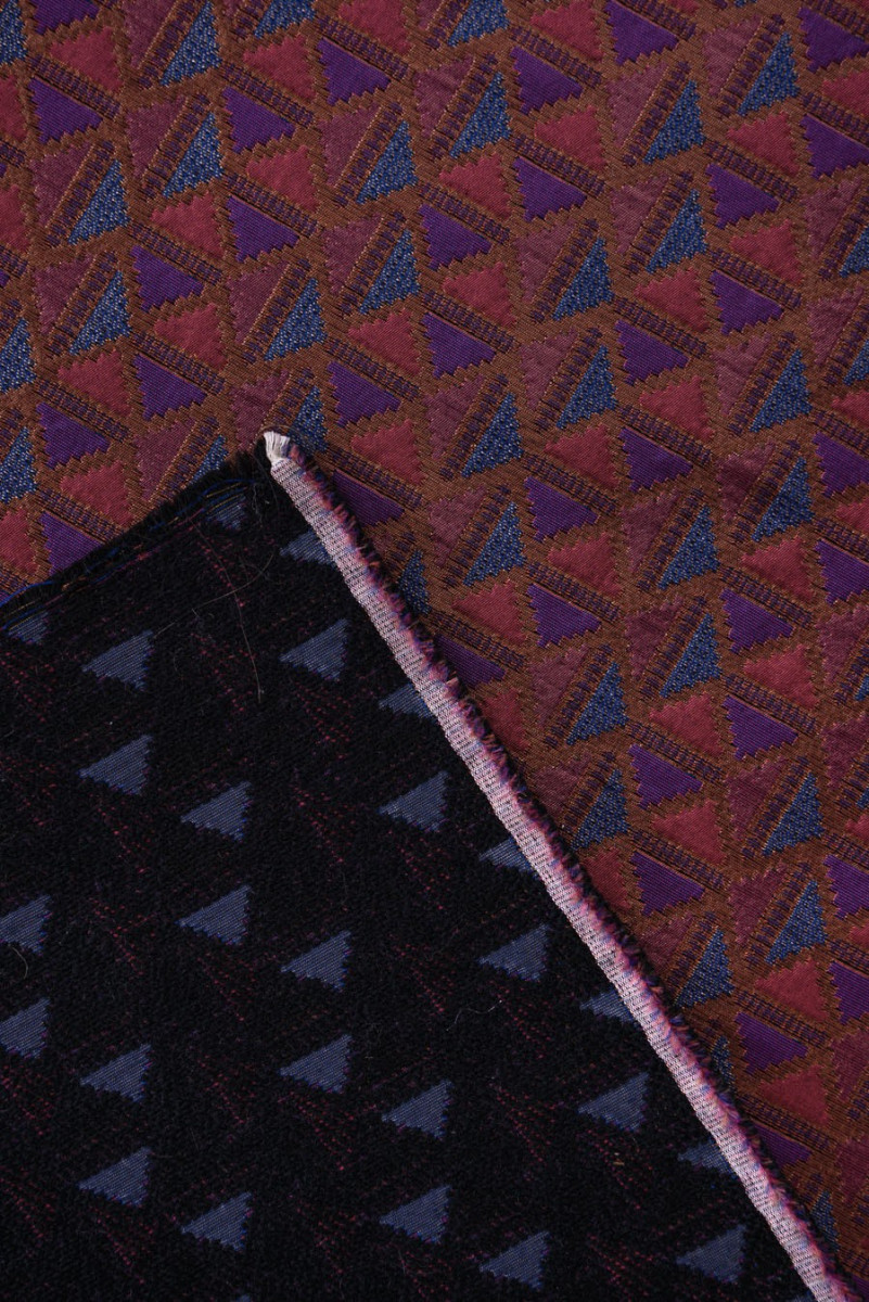 Tissu jacquard italien plus épais avec de petits motifs géométriques. Couleurs : violet, bleu, rouge, rose.