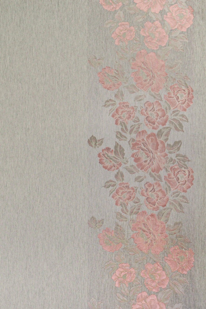 Tissu de costume jacquard italien en mélange gris avec un motif de fleurs roses. Le tissu est livré dans un coupon avec des dimensions de 110 cm * 153 cm. La partie supérieure du coupon est lisse, en bas nous avons un beau motif floral de 40 cm de large.