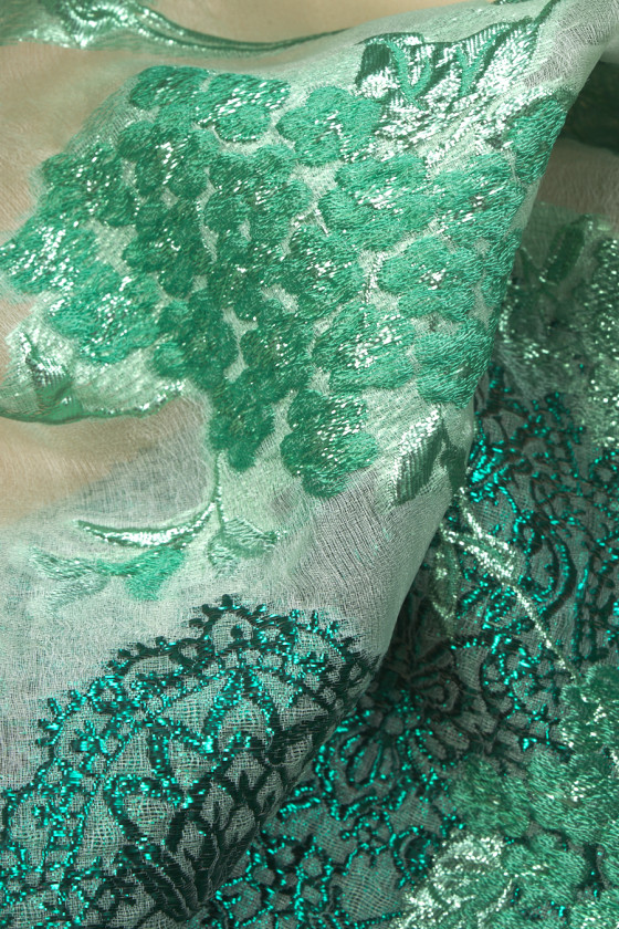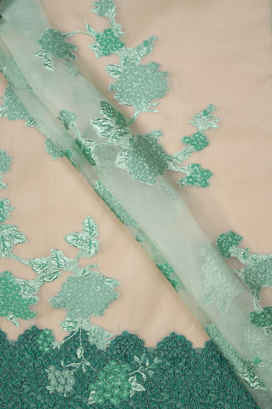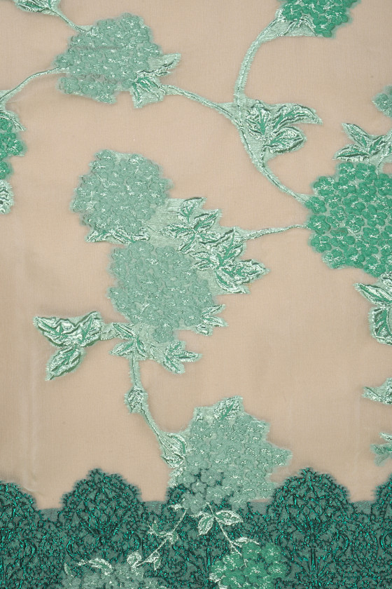 Tissu organza italien en coupon mesurant 200 cm* 140 cm, décoré de fil de lurex. Tissu menthe avec un motif jacquard de fleurs buz en vert, le motif s’épaissit vers le bas du coupon, qui est fini par une bande de 25 cm de large de couleur vert bouteille.
