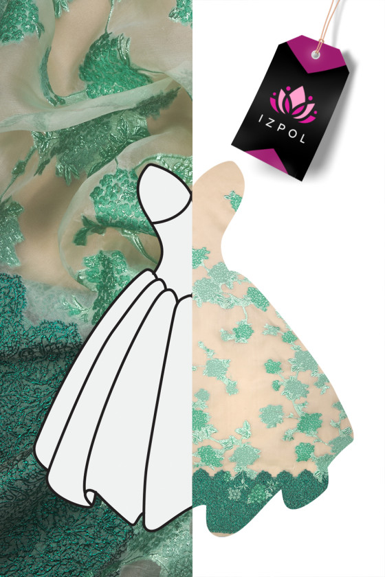 Tissu en organza italien dans un coupon mesurant 200 cm* 140 cm, décoré de fil de lurex. Tissu menthe avec un motif jacquard de fleurs buz en vert, le motif s’épaissit vers le bas du coupon, qui est fini par une bande de 25 cm de large de couleur vert bouteille. Le tissu est fin, transparent, non élastique, légèrement rigide. Parfait pour coudre une robe ou une jupe.