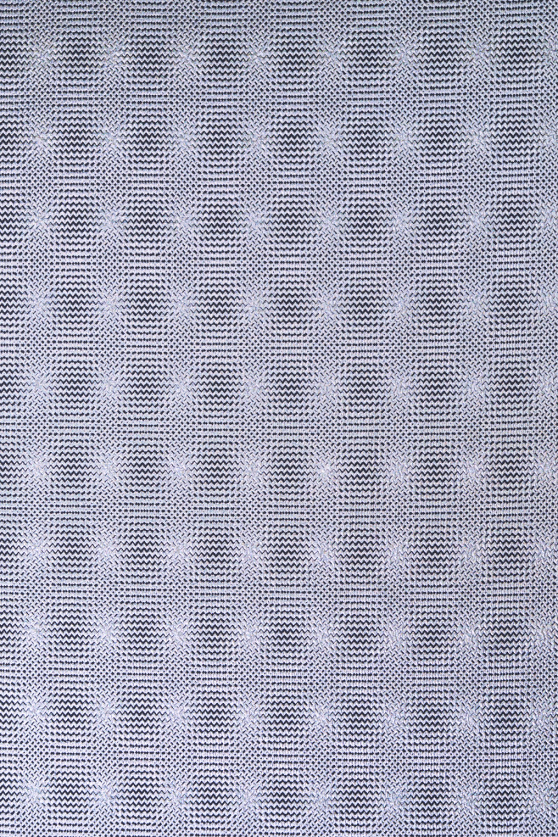 Tissu de costume jacquard italien noir avec un motif de petits zigzags. Le motif délicat est composé d’un fil multicolore qui scintille de toute une palette de couleurs en fonction de l’angle d’incidence de la lumière. Le motif est réalisé verticalement et horizontalement, ce qui lui permet de créer un motif à carreaux subtil. Le tissu peut être cousu des deux côtés, ce qui est plus subtil et plus foncé. Le matériau est d’épaisseur moyenne, légèrement rigide et inélastique. Une belle proposition pour les personnes qui aiment les tissus brillants et efficaces.